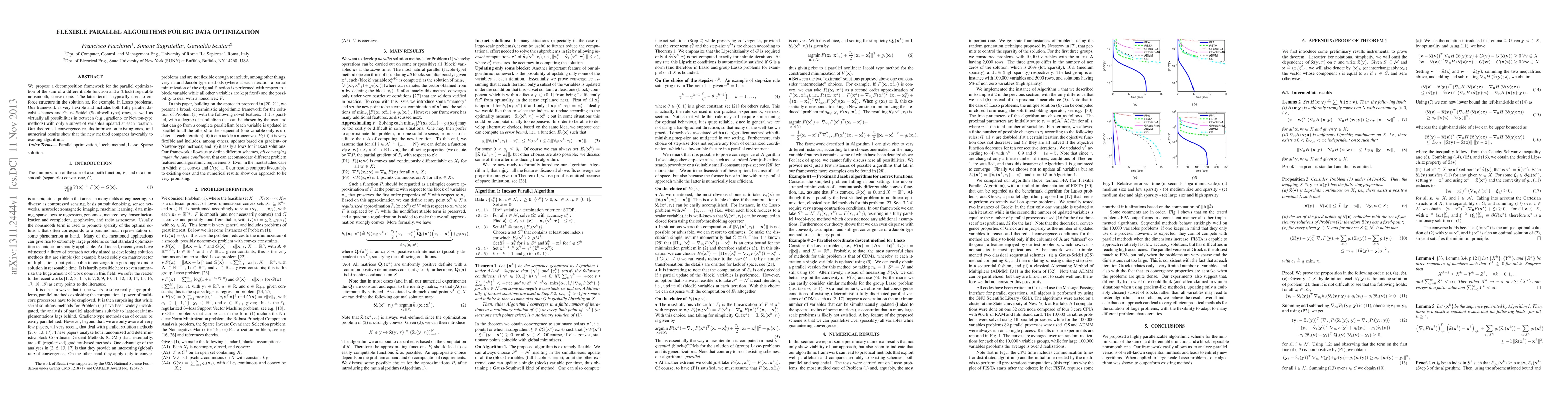 This paper introduces a flexible decomposition framework for parallel optimization of big data problems, combining differentiable and separable nonsmooth convex functions. It offers various parallel schemes, including Jacobi and Gauss-Seidel methods, and demonstrates improved theoretical convergence and superior performance over existing algorithms.