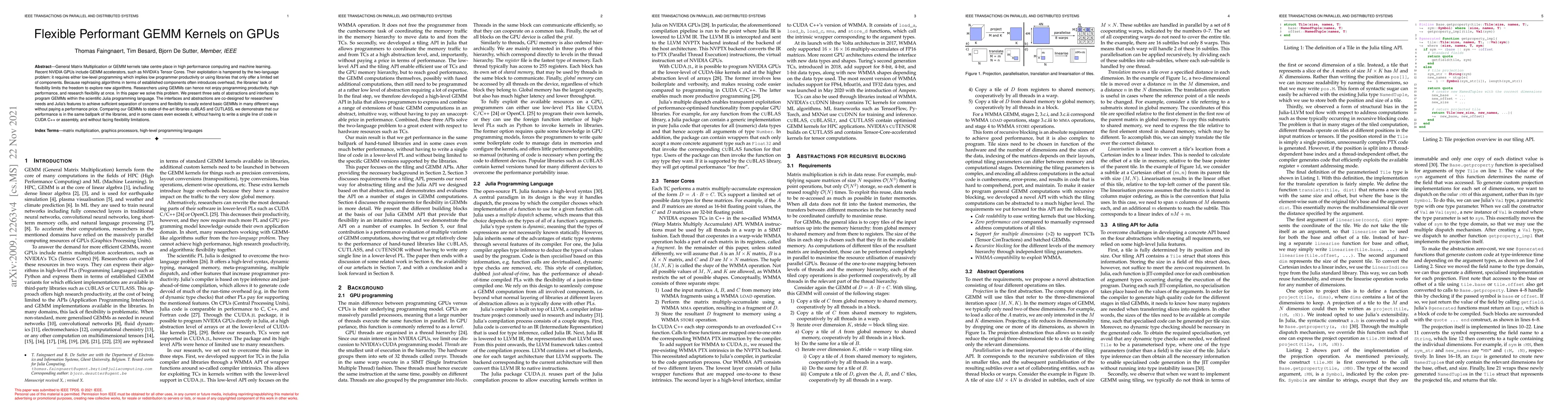 This paper introduces flexible and high-performance GEMM kernels for GPUs using the Julia programming language, addressing the two-language problem by offering abstractions that balance programmer productivity, performance, and research flexibility without sacrificing any of these aspects. The proposed solution competes with state-of-the-art libraries like cuBLAS and CUTLASS in performance.