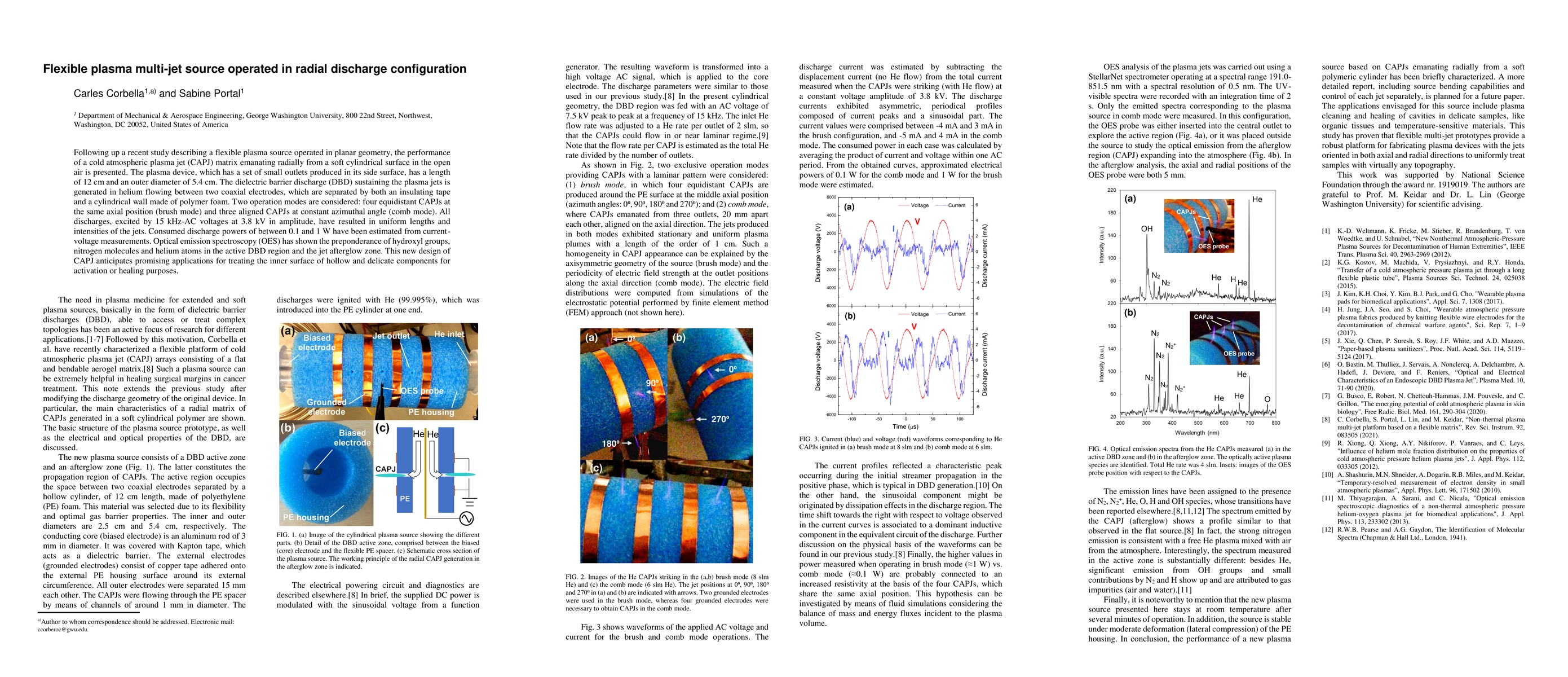 This paper presents a flexible radial discharge plasma source with multiple cold atmospheric plasma jets emanating from a cylindrical surface. The device operates in brush and comb modes, showing uniform jet lengths and intensities, and has potential applications for treating delicate inner surfaces.