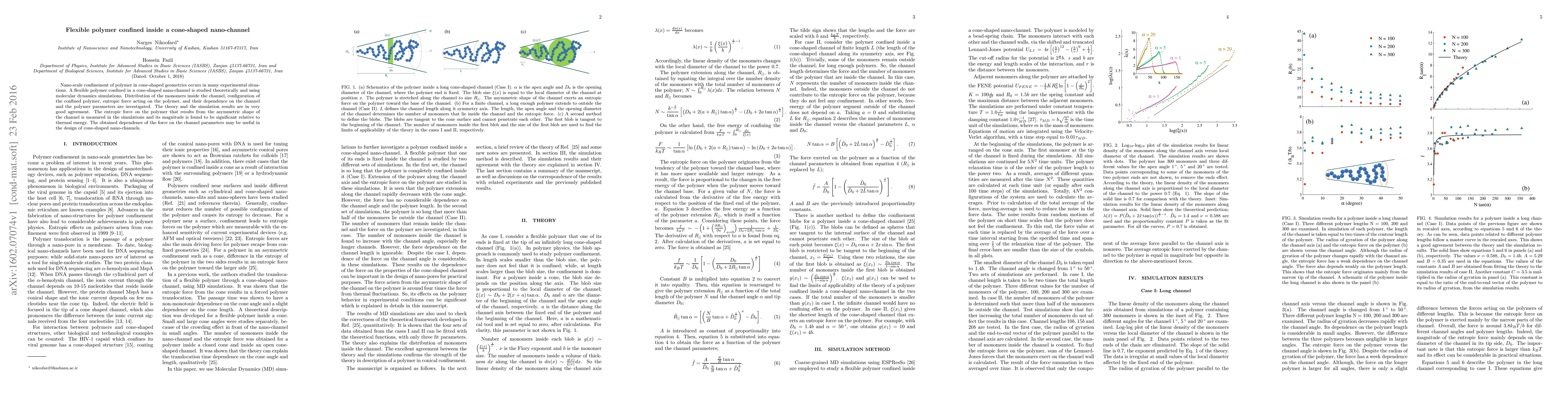 This paper investigates the behavior of a flexible polymer confined within a cone-shaped nano-channel using theoretical analysis and molecular dynamics simulations. The study reveals significant entropic forces due to the asymmetric channel shape, which could inform the design of such nano-channel systems.