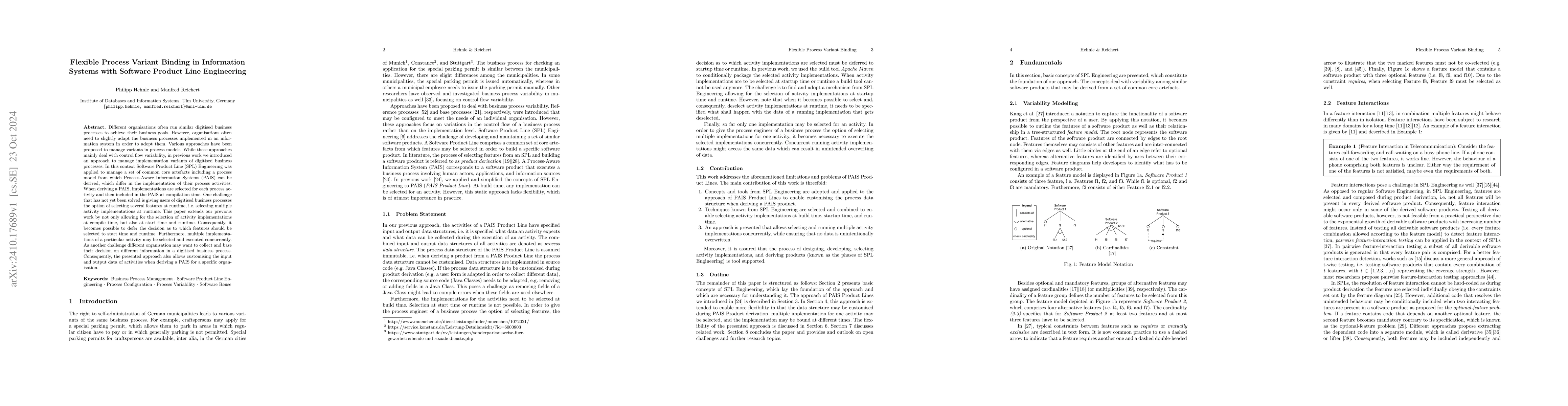 This paper proposes an extension to manage flexible process variant binding in information systems, allowing for activity implementation selection at compile, start, and runtime. It addresses the challenge of enabling organisations to choose different features and customise input/output data of activities in digitised business processes through Software Product Line Engineering.