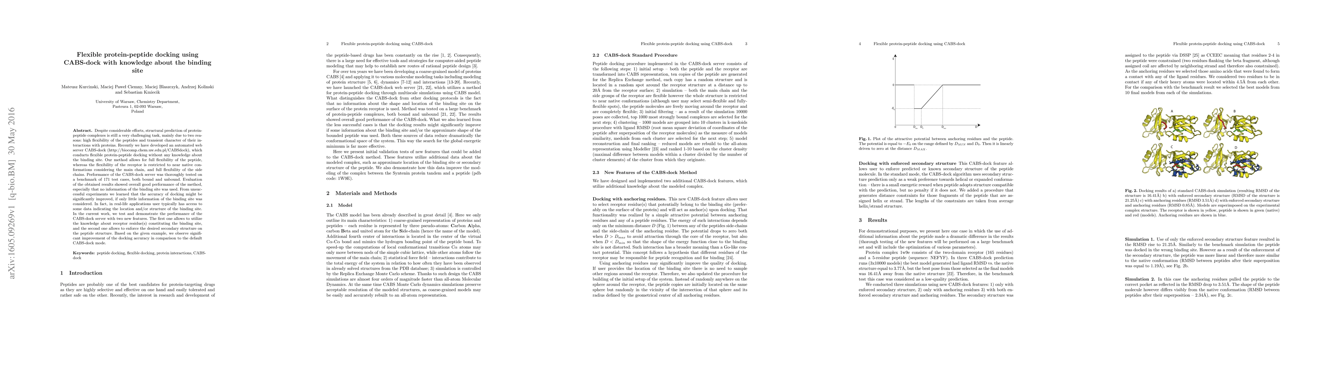 The CABS-dock server enhances flexible protein-peptide docking by incorporating knowledge of the binding site, significantly improving accuracy. The method allows full peptide flexibility and partial receptor flexibility, achieving good performance even without prior binding site information.