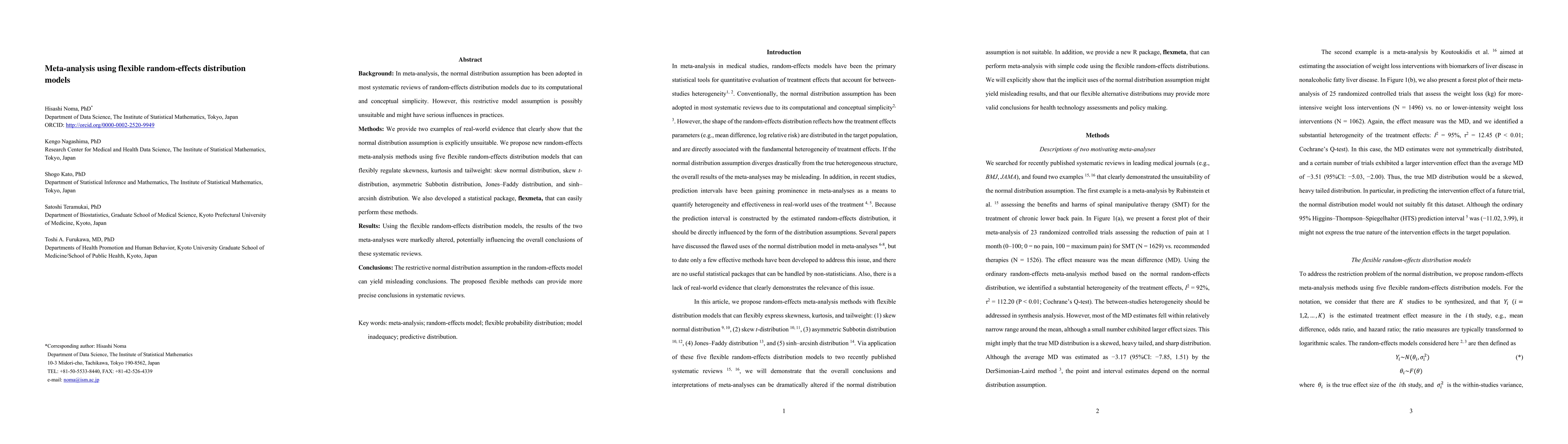 In meta-analysis, the random-effects models are standard tools to address between-study heterogeneity in evidence synthesis analyses. For the random-effects distribution models, the normal distribution model has been adopted in most systematic reviews due to its computational and conceptual simplicity. However, the restrictive model assumption might have serious influences on the overall conclusions in practices. In this article, we first provide two examples of real-world evidence that clearly show that the normal distribution assumption is unsuitable. To address the model restriction problem, we propose alternative flexible random-effects models that can flexibly regulate skewness, kurtosis and tailweight: skew normal distribution, skew t-distribution, asymmetric Subbotin distribution, Jones-Faddy distribution, and sinh-arcsinh distribution. We also developed a R package, flexmeta, that can easily perform these methods. Using the flexible random-effects distribution models, the results of the two meta-analyses were markedly altered, potentially influencing the overall conclusions of these systematic reviews. The flexible methods and computational tools can provide more precise evidence, and these methods would be recommended at least as sensitivity analysis tools to assess the influence of the normal distribution assumption of the random-effects model.