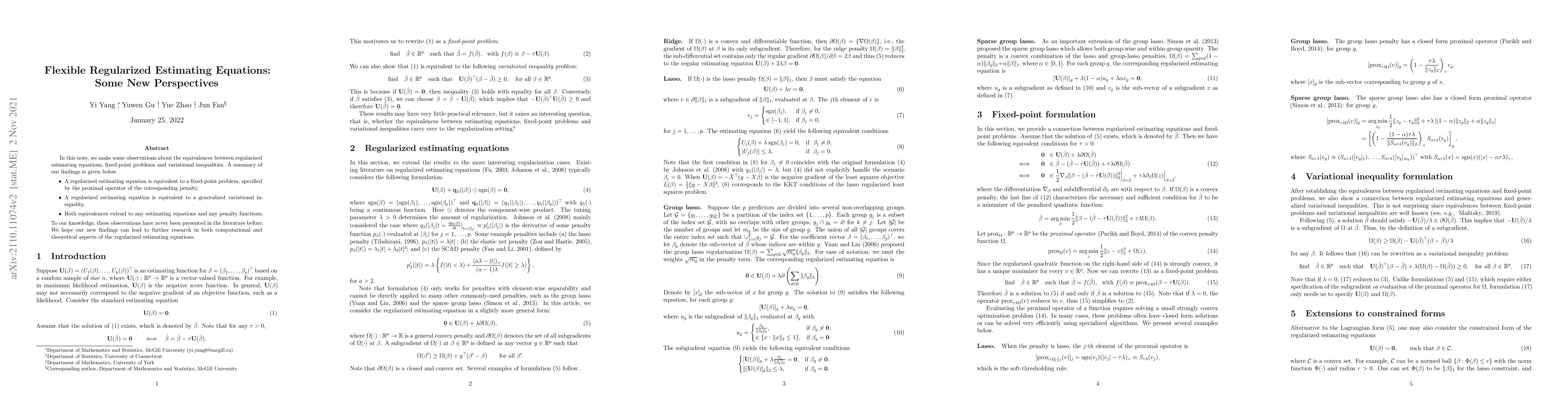 In this note, we make some observations about the equivalences between regularized estimating equations, fixed-point problems and variational inequalities. A summary of our findings is given below: (a) A regularized estimating equation is equivalent to a fixed-point problem, specified by the proximal operator of the corresponding penalty; (b) A regularized estimating equation is equivalent to a generalized variational inequality; (c) Both equivalences extend to any estimating equations and any penalty functions. To our knowledge, these observations have never been presented in the literature before. We hope our new findings can lead to further research in both computational and theoretical aspects of regularized estimating equations.
