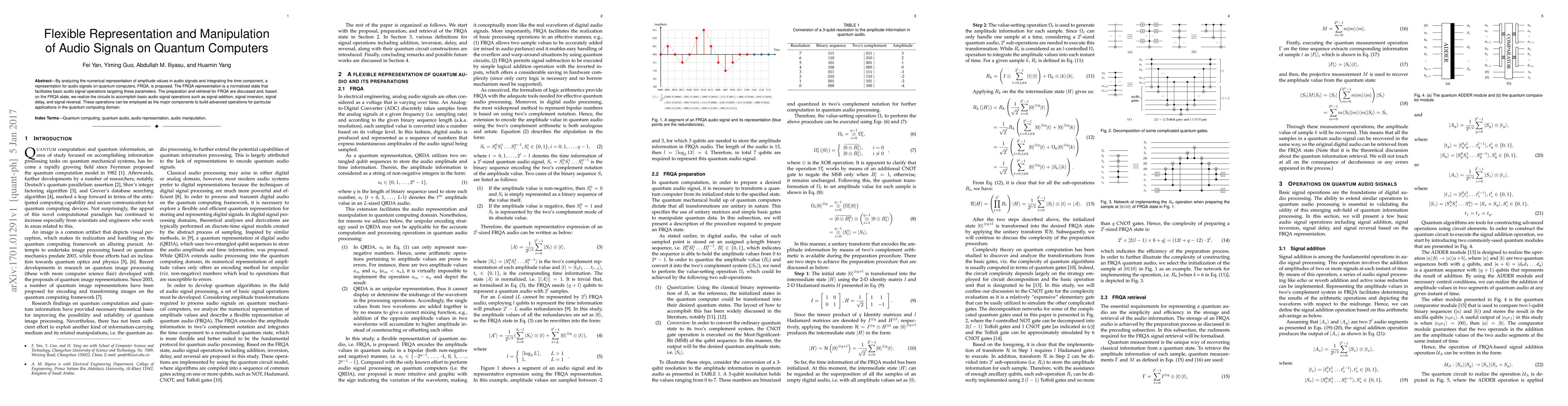 This paper proposes FRQA, a normalized quantum representation for audio signals, enabling basic operations like signal addition, inversion, delay, and reversal on quantum computers. The FRQA state facilitates efficient manipulation of audio signals, serving as a foundation for more advanced quantum audio processing applications.