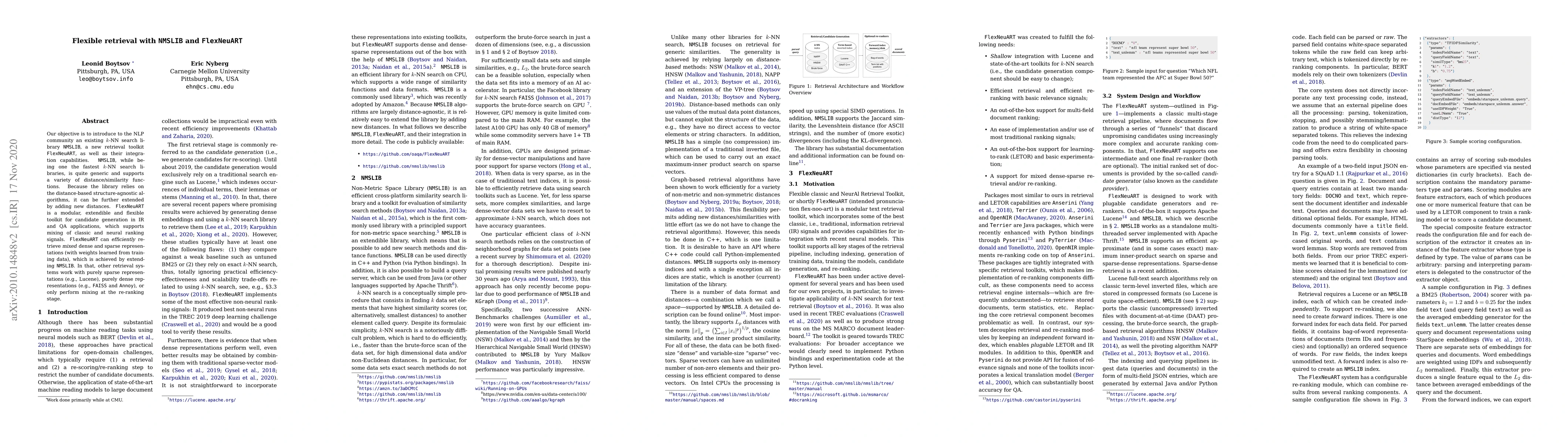 Our objective is to introduce to the NLP community an existing k-NN search library NMSLIB, a new retrieval toolkit FlexNeuART, as well as their integration capabilities. NMSLIB, while being one the fastest k-NN search libraries, is quite generic and supports a variety of distance/similarity functions. Because the library relies on the distance-based structure-agnostic algorithms, it can be further extended by adding new distances. FlexNeuART is a modular, extendible and flexible toolkit for candidate generation in IR and QA applications, which supports mixing of classic and neural ranking signals. FlexNeuART can efficiently retrieve mixed dense and sparse representations (with weights learned from training data), which is achieved by extending NMSLIB. In that, other retrieval systems work with purely sparse representations (e.g., Lucene), purely dense representations (e.g., FAISS and Annoy), or only perform mixing at the re-ranking stage.
