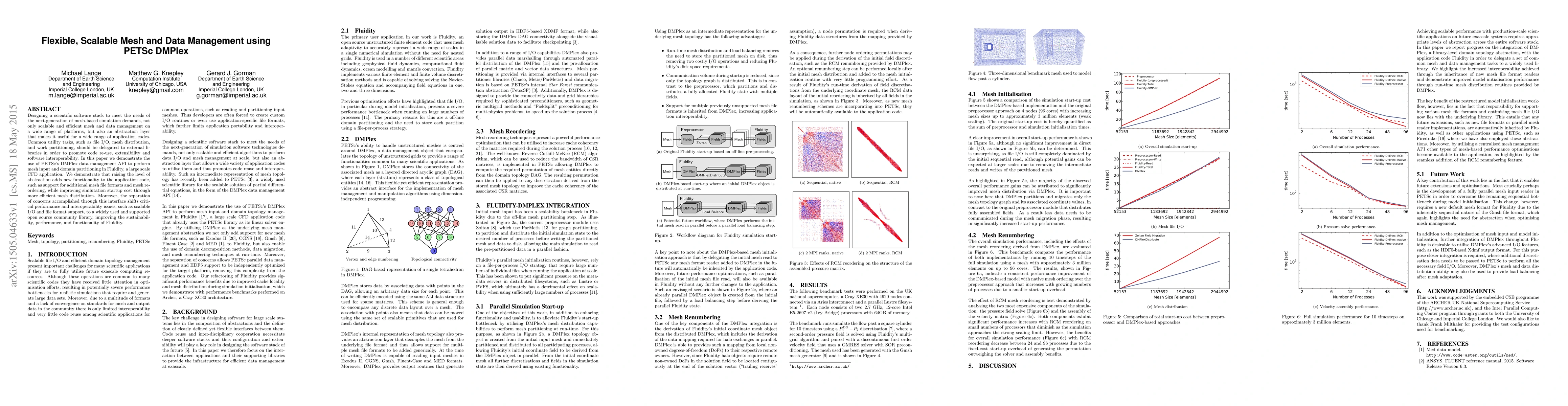 Designing a scientific software stack to meet the needs of the next-generation of mesh-based simulation demands, not only scalable and efficient mesh and data management on a wide range of platforms, but also an abstraction layer that makes it useful for a wide range of application codes. Common utility tasks, such as file I/O, mesh distribution, and work partitioning, should be delegated to external libraries in order to promote code re-use, extensibility and software interoperability. In this paper we demonstrate the use of PETSc's DMPlex data management API to perform mesh input and domain partitioning in Fluidity, a large scale CFD application. We demonstrate that raising the level of abstraction adds new functionality to the application code, such as support for additional mesh file formats and mesh re- ordering, while improving simulation startup cost through more efficient mesh distribution. Moreover, the separation of concerns accomplished through this interface shifts critical performance and interoperability issues, such as scalable I/O and file format support, to a widely used and supported open source community library, improving the sustainability, performance, and functionality of Fluidity.