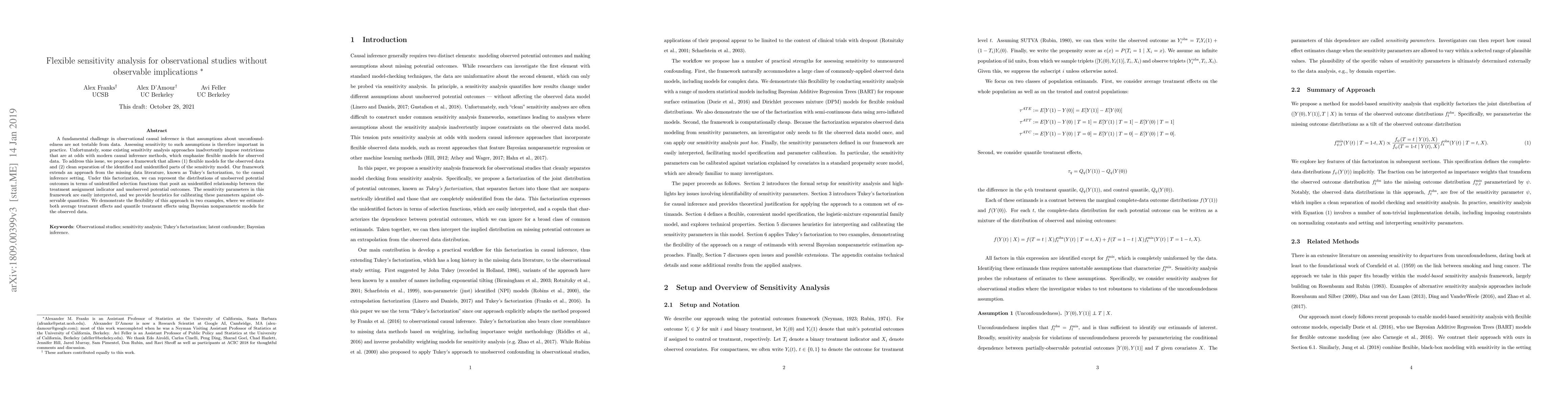 This paper proposes a flexible sensitivity analysis framework for observational studies that allows for adaptable models of observed data and cleanly separates identified and unidentified parts of the sensitivity model. The approach extends Tukey's factorization from missing data to causal inference, enabling interpretable sensitivity parameters and demonstrating its utility in estimating average and quantile treatment effects.