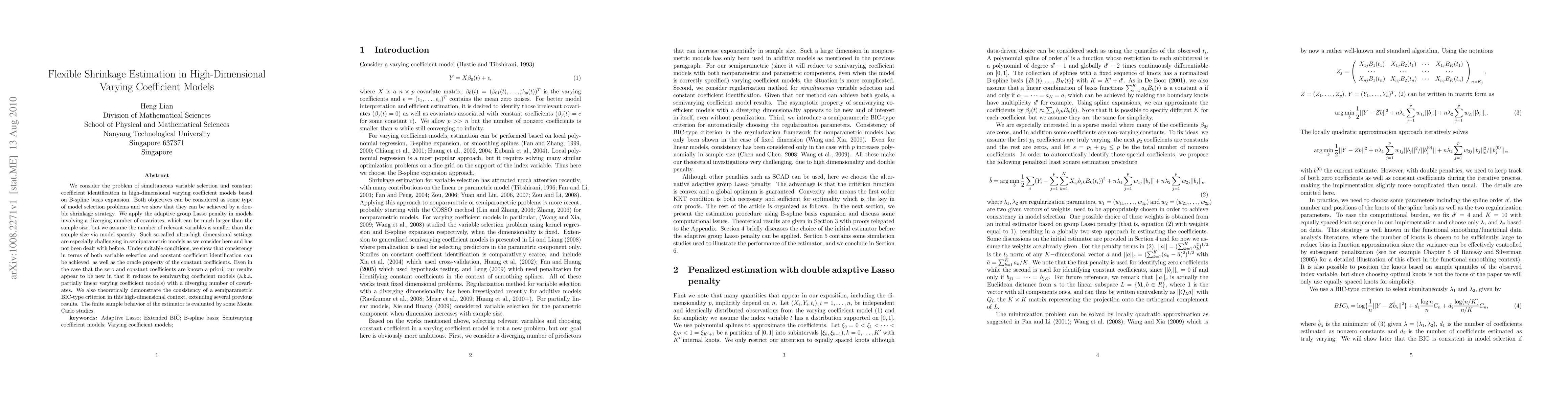 This paper proposes a double shrinkage strategy using adaptive group Lasso for simultaneous variable selection and constant coefficient identification in high-dimensional varying coefficient models. It addresses the challenges of ultra-high dimensional settings, demonstrating consistency and the oracle property of the constant coefficients, and extending previous results to semivarying coefficient models.