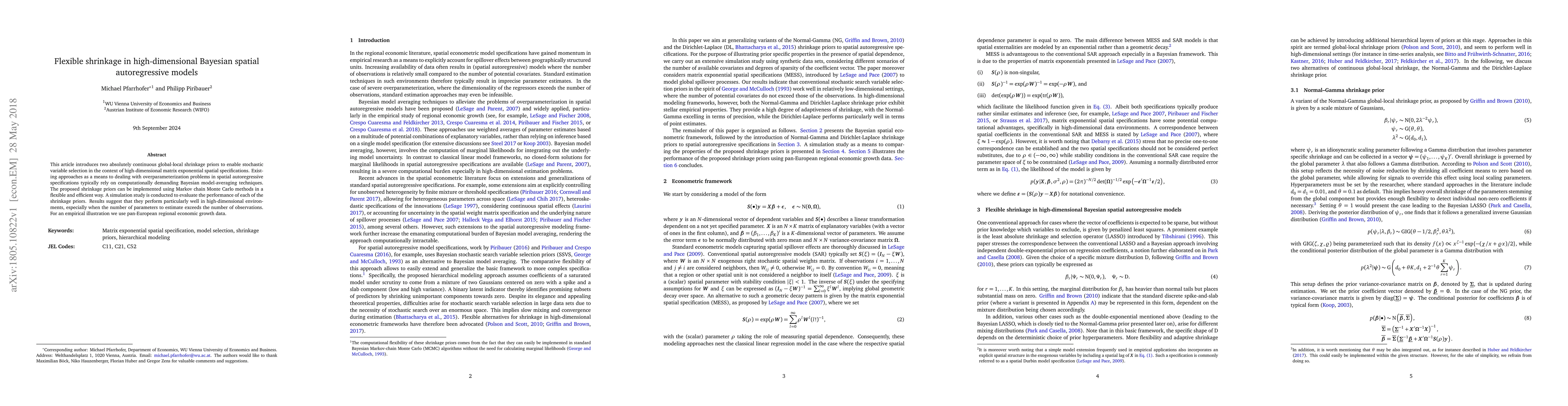 This article introduces two absolutely continuous global-local shrinkage priors to enable stochastic variable selection in the context of high-dimensional matrix exponential spatial specifications. Existing approaches as a means to dealing with overparameterization problems in spatial autoregressive specifications typically rely on computationally demanding Bayesian model-averaging techniques. The proposed shrinkage priors can be implemented using Markov chain Monte Carlo methods in a flexible and efficient way. A simulation study is conducted to evaluate the performance of each of the shrinkage priors. Results suggest that they perform particularly well in high-dimensional environments, especially when the number of parameters to estimate exceeds the number of observations. For an empirical illustration we use pan-European regional economic growth data.