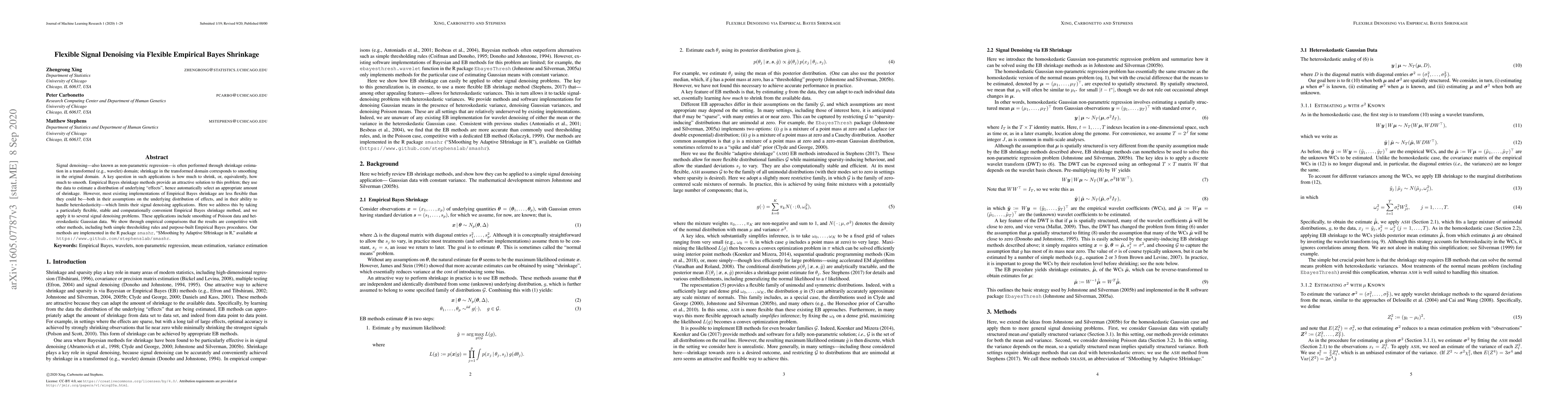 This paper proposes a flexible empirical Bayes shrinkage method for signal denoising, addressing limitations in existing implementations by allowing more flexible assumptions and handling heteroskedasticity. The method is shown to perform competitively in denoising Poisson and heteroskedastic Gaussian data, and is available in the R package smashr.