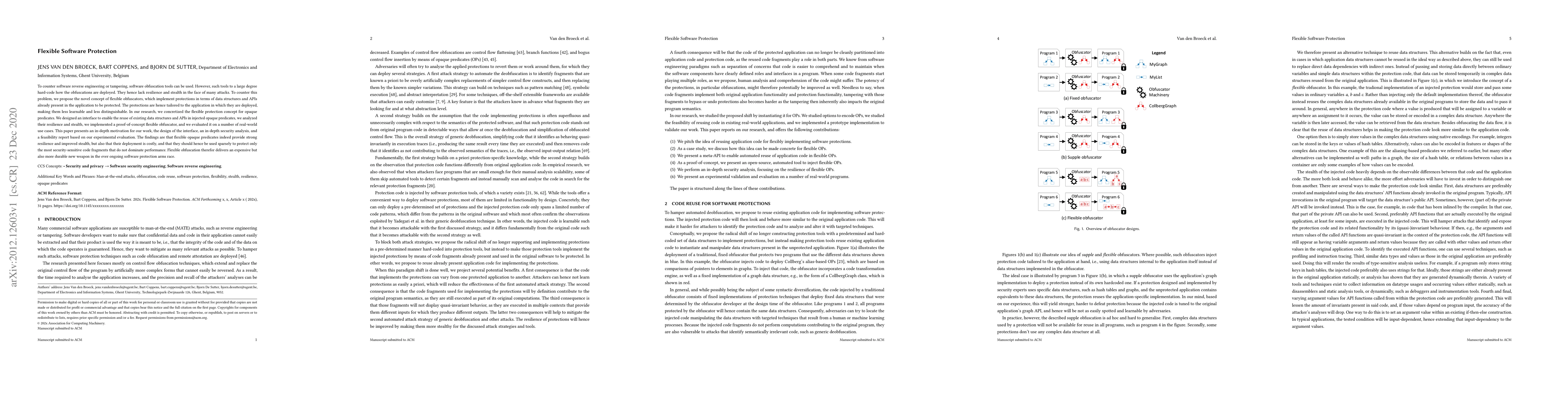 To counter software reverse engineering or tampering, software obfuscation tools can be used. However, such tools to a large degree hard-code how the obfuscations are deployed. They hence lack resilience and stealth in the face of many attacks. To counter this problem, we propose the novel concept of flexible obfuscators, which implement protections in terms of data structures and APIs already present in the application to be protected. The protections are hence tailored to the application in which they are deployed, making them less learnable and less distinguishable. In our research, we concretized the flexible protection concept for opaque predicates. We designed an interface to enable the reuse of existing data structures and APIs in injected opaque predicates, we analyzed their resilience and stealth, we implemented a proof-of-concept flexible obfuscator, and we evaluated it on a number of real-world use cases. This paper presents an in-depth motivation for our work, the design of the interface, an in-depth security analysis, and a feasibility report based on our experimental evaluation. The findings are that flexible opaque predicates indeed provide strong resilience and improved stealth, but also that their deployment is costly, and that they should hence be used sparsely to protect only the most security-sensitive code fragments that do not dominate performance. Flexible obfuscation therefor delivers an expensive but also more durable new weapon in the ever ongoing software protection arms race.