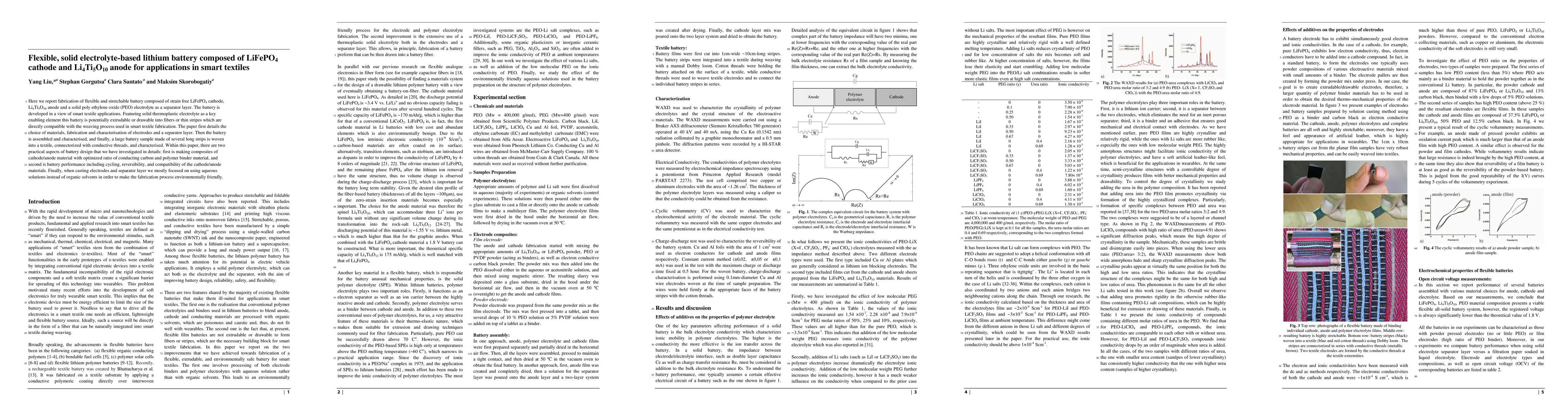 This paper details the fabrication of a flexible, solid electrolyte-based lithium battery using LiFePO4 cathode and Li4Ti5O10 anode for smart textile applications, emphasizing environmentally friendly aqueous processing and optimized composites for enhanced performance. The battery's solid thermoplastic electrolyte enables it to be woven into textiles, and its performance in cycling and reversibility is thoroughly characterized.
