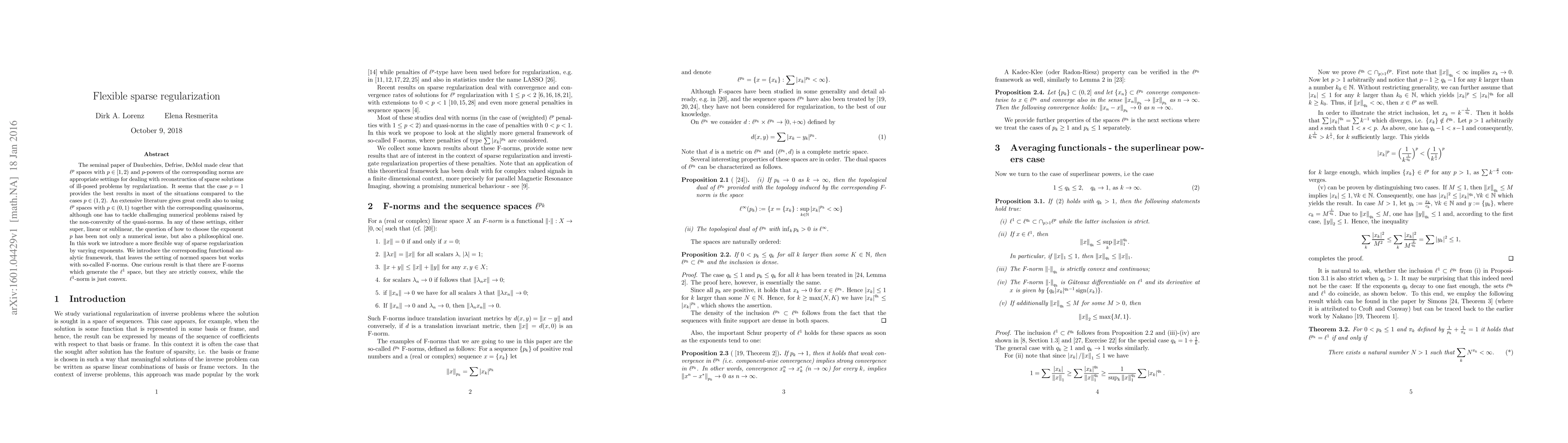 Researchers introduce a flexible way of sparse regularization by varying exponents, offering a new functional analytic framework that generates $ell^1$ space with strictly convex norms, improving upon previous settings for ill-posed problems.