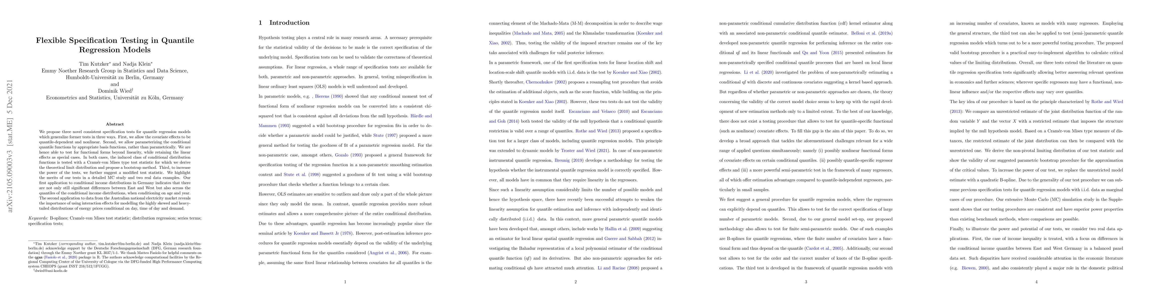 This paper introduces three consistent specification tests for quantile regression models, allowing for quantile-dependent and nonlinear covariate effects, and flexible functional forms beyond linearity. The tests are validated through Monte Carlo simulations and real-world applications, highlighting their effectiveness in detecting differences in income distributions and modeling energy prices.