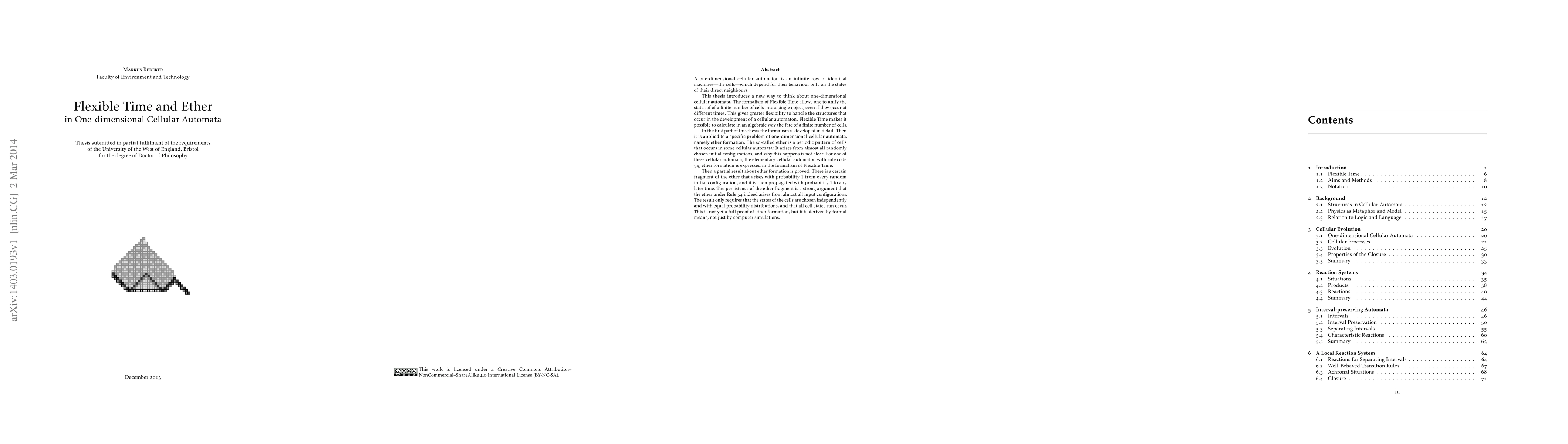 Flexible Time is a new formalism for calculations about one-dimensional cellular automata. It unifies the states of a finite number of cells into a single object, even if they occur at different times. This gives greater flexibility to handle the structures that occur in the development of a cellular automaton. An ether is a periodic pattern of cells that arises in some cellular automata from almost all random initial configurations. In this thesis, the formalism is developed in detail and then applied to the problem of ether formation. For the elementary cellular automaton Rule 54, a partial result is proved: There is a fragment of the ether that arises with probability 1 from every random initial configuration and is propagated with probability 1 to any later time. This is a strong argument that the ether under Rule 54 indeed arises from almost all input configurations.