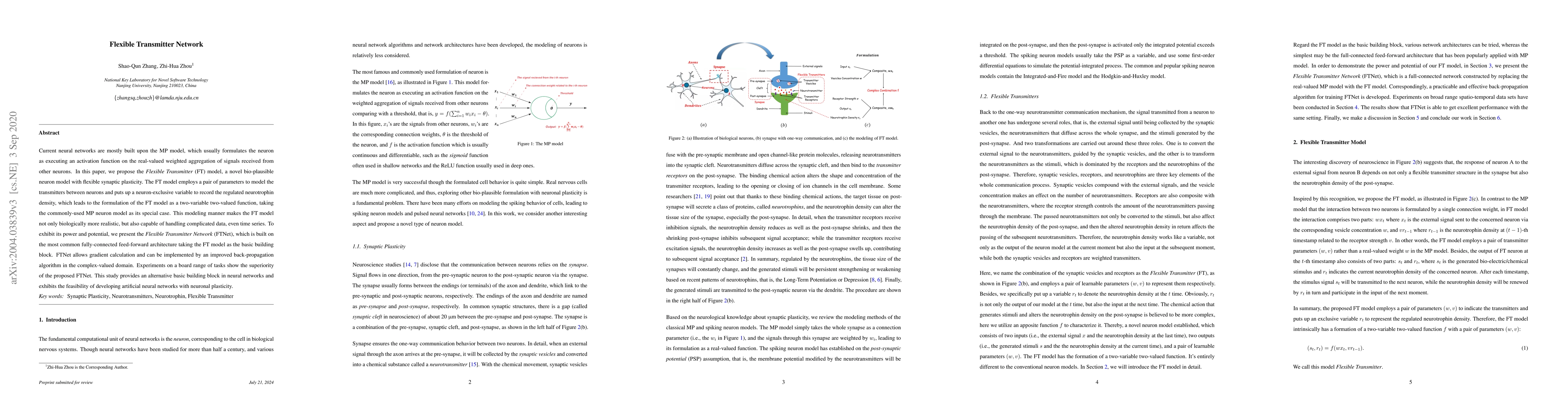 The Flexible Transmitter Network (FTNet) model proposes a novel bio-plausible neuron model with flexible synaptic plasticity, outperforming the traditional MP model in a range of tasks, including time series data analysis.