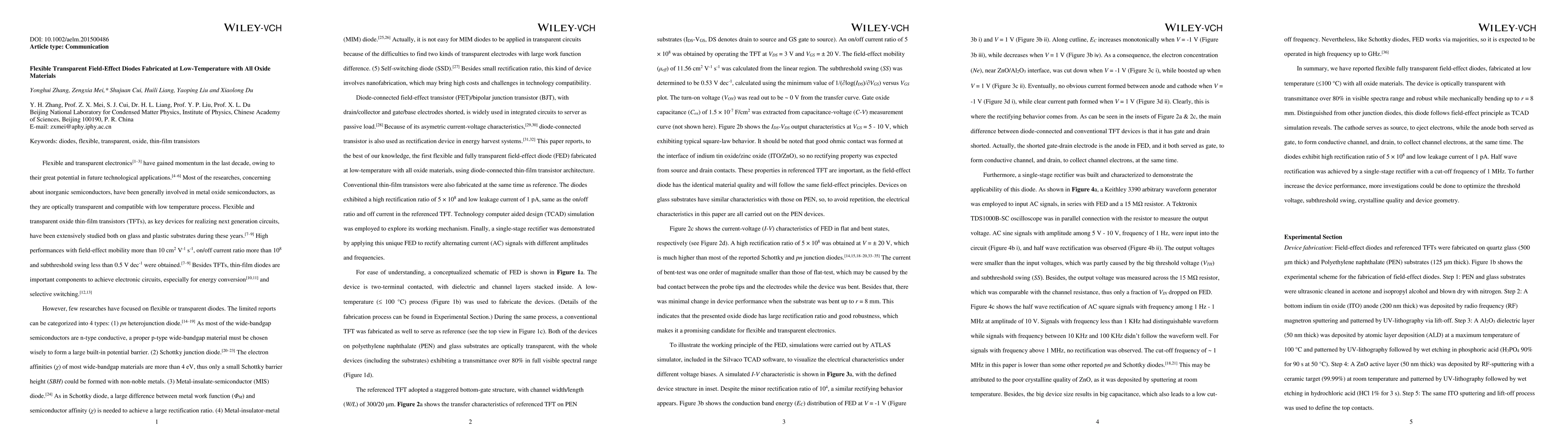 Flexible fully transparent diodes with high rectification ratio of 5 e 8 are fabricated with all oxide materials at low temperature. The devices are optically transparent in visible spectra range and electrically robust while mechanically bending. Distinguished from other diodes, these diodes utilize diode-connected thin-film transistor architecture and follow field-effect principles.