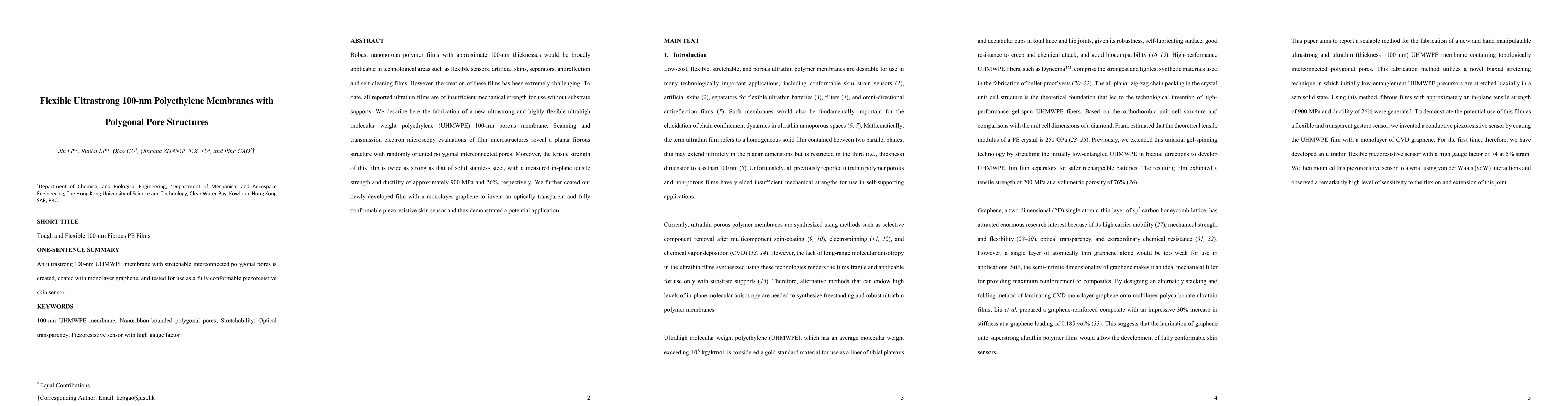 This paper presents the fabrication of ultrastrong, flexible 100-nm polyethylene membranes with polygonal pore structures, achieving tensile strength twice that of solid stainless steel. The membranes, coated with graphene, show promise for use in flexible sensors and other advanced applications.