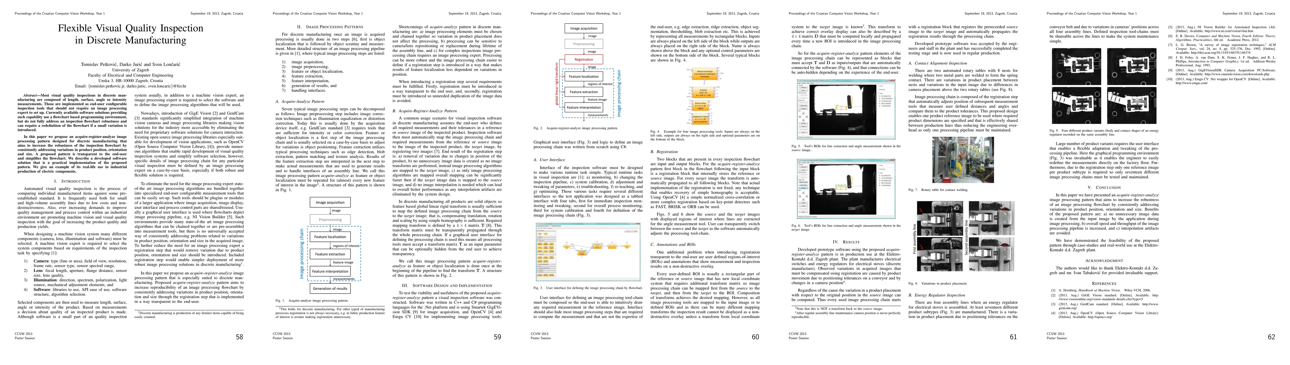This paper presents an acquire-register-analyze image processing pattern to enhance the robustness of visual quality inspections in discrete manufacturing, addressing variations in product position, orientation, and size. The proposed solution simplifies inspection flowcharts, making it user-friendly and applicable to industrial production, as demonstrated in the manufacturing of electric components.