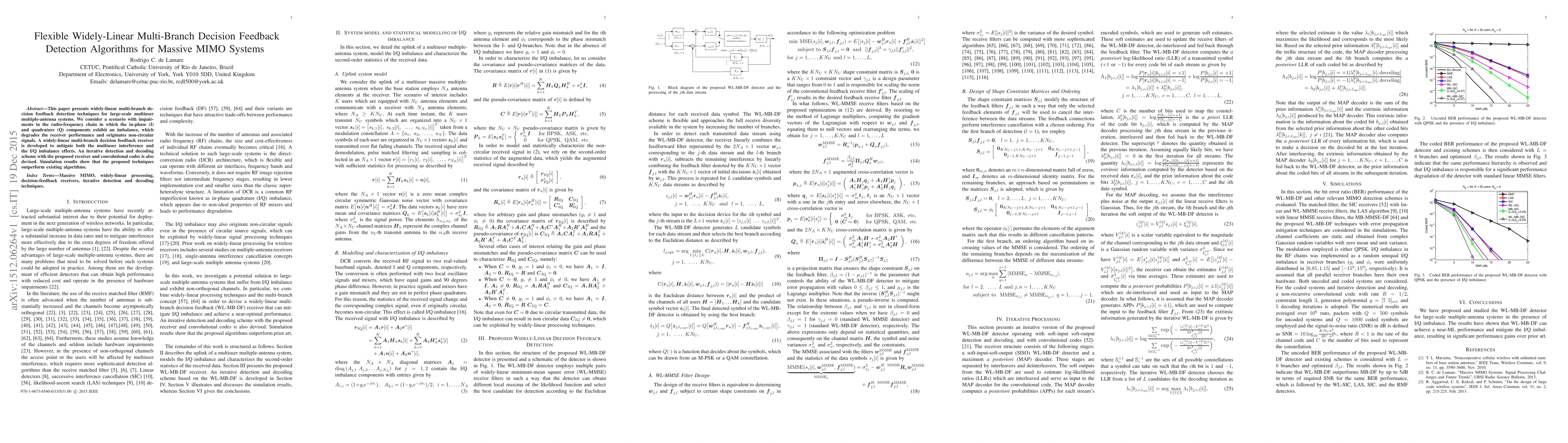 This paper introduces widely-linear multi-branch decision feedback detection algorithms for massive MIMO systems, addressing radio-frequency chain impairments and I/Q imbalance. The proposed receiver effectively mitigates multiuser interference and I/Q imbalance, leading to superior performance compared to existing methods, as demonstrated by simulations.