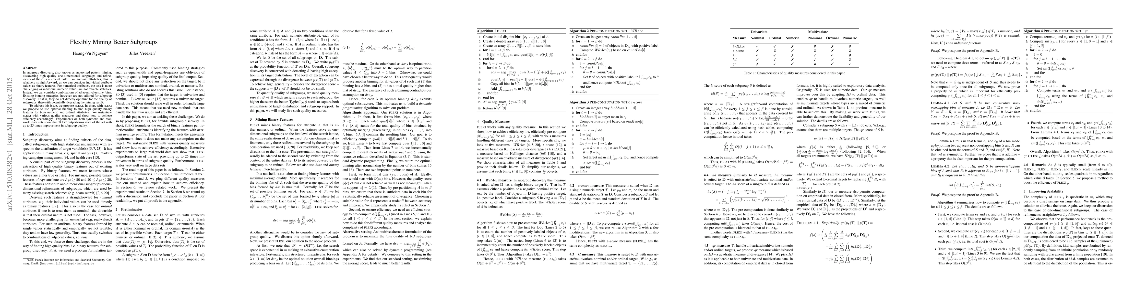 In subgroup discovery, also known as supervised pattern mining, discovering high quality one-dimensional subgroups and refinements of these is a crucial task. For nominal attributes, this is relatively straightforward, as we can consider individual attribute values as binary features. For numerical attributes, the task is more challenging as individual numeric values are not reliable statistics. Instead, we can consider combinations of adjacent values, i.e. bins. Existing binning strategies, however, are not tailored for subgroup discovery. That is, they do not directly optimize for the quality of subgroups, therewith potentially degrading the mining result. To address this issue, we propose FLEXI. In short, with FLEXI we propose to use optimal binning to find high quality binary features for both numeric and ordinal attributes. We instantiate FLEXI with various quality measures and show how to achieve efficiency accordingly. Experiments on both synthetic and real-world data sets show that FLEXI outperforms state of the art with up to 25 times improvement in subgroup quality.