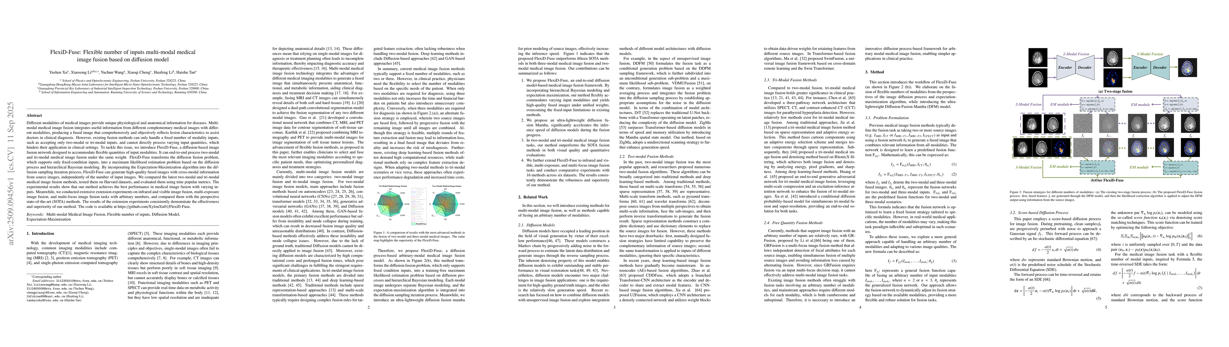 Different modalities of medical images provide unique physiological and anatomical information for diseases. Multi-modal medical image fusion integrates useful information from different complementary medical images with different modalities, producing a fused image that comprehensively and objectively reflects lesion characteristics to assist doctors in clinical diagnosis. However, existing fusion methods can only handle a fixed number of modality inputs, such as accepting only two-modal or tri-modal inputs, and cannot directly process varying input quantities, which hinders their application in clinical settings. To tackle this issue, we introduce FlexiD-Fuse, a diffusion-based image fusion network designed to accommodate flexible quantities of input modalities. It can end-to-end process two-modal and tri-modal medical image fusion under the same weight. FlexiD-Fuse transforms the diffusion fusion problem, which supports only fixed-condition inputs, into a maximum likelihood estimation problem based on the diffusion process and hierarchical Bayesian modeling. By incorporating the Expectation-Maximization algorithm into the diffusion sampling iteration process, FlexiD-Fuse can generate high-quality fused images with cross-modal information from source images, independently of the number of input images. We compared the latest two and tri-modal medical image fusion methods, tested them on Harvard datasets, and evaluated them using nine popular metrics. The experimental results show that our method achieves the best performance in medical image fusion with varying inputs. Meanwhile, we conducted extensive extension experiments on infrared-visible, multi-exposure, and multi-focus image fusion tasks with arbitrary numbers, and compared them with the perspective SOTA methods. The results of the extension experiments consistently demonstrate the effectiveness and superiority of our method.