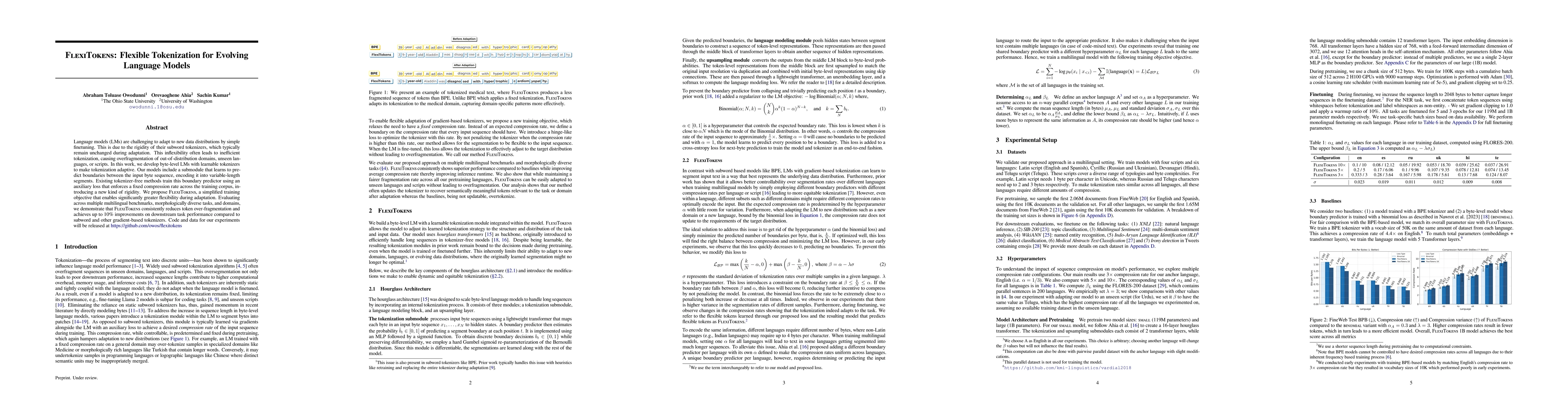 The paper introduces FLEXITOKENS, a flexible, gradient-based tokenization approach that enables language models to adapt their segmentation patterns during fine-tuning. It contrasts with previous methods that enforce static or fixed compression rates.