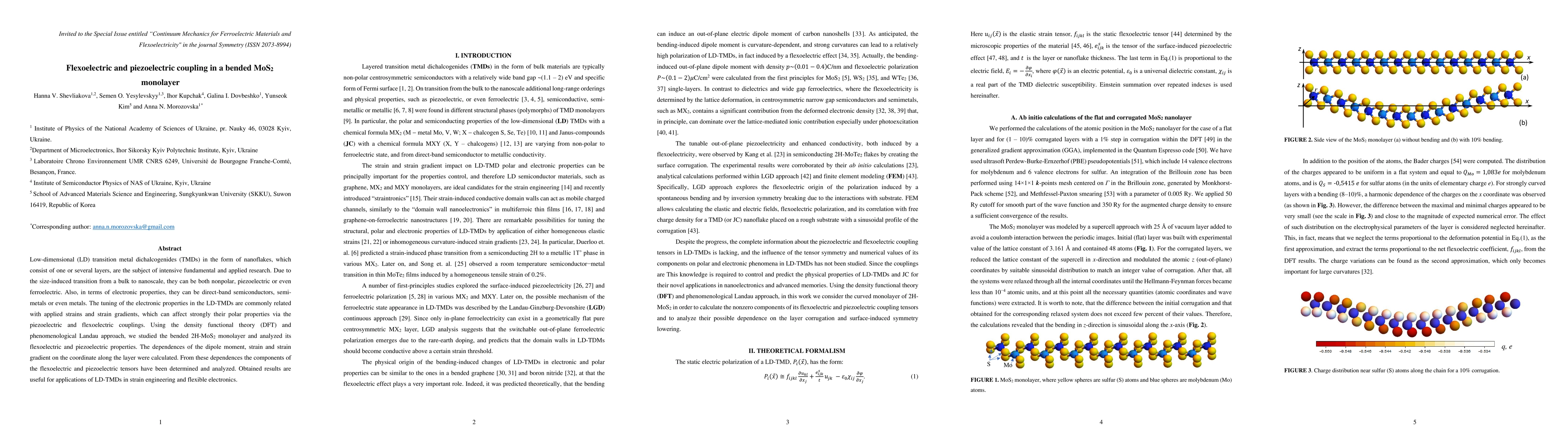 Low-dimensional (LD) transition metal dichalcogenides (TMDs) in the form of nanoflakes, which consist of one or several layers, are the subject of intensive fundamental and applied research. Due to the size-induced transition from a bulk to nanoscale, they can be both nonpolar, piezoelectric or even ferroelectric. Also, in terms of electronic properties, they can be direct-band semiconductors, semi-metals or even metals. The tuning of the electronic properties in the LD-TMDs are commonly related with applied strains and strain gradients, which can affect strongly their polar properties via the piezoelectric and flexoelectric couplings. Using the density functional theory (DFT) and phenomenological Landau approach, we studied the bended 2H-MoS$_2$ monolayer and analyzed its flexoelectric and piezoelectric properties. The dependences of the dipole moment, strain and strain gradient on the coordinate along the layer were calculated. From these dependences the components of the flexoelectric and piezoelectric tensors have been determined and analyzed. Obtained results are useful for applications of LD-TMDs in strain engineering and flexible electronics.