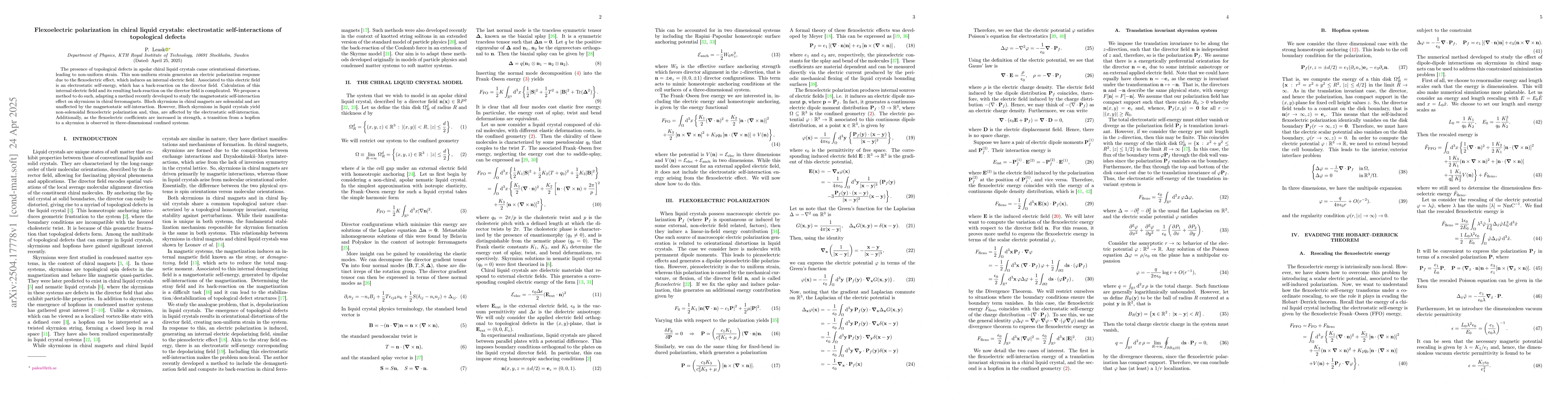 The paper introduces a method to calculate the self-energy of flexoelectric polarization and its back-reaction on the director field, adapting a method from chiral ferromagnets.