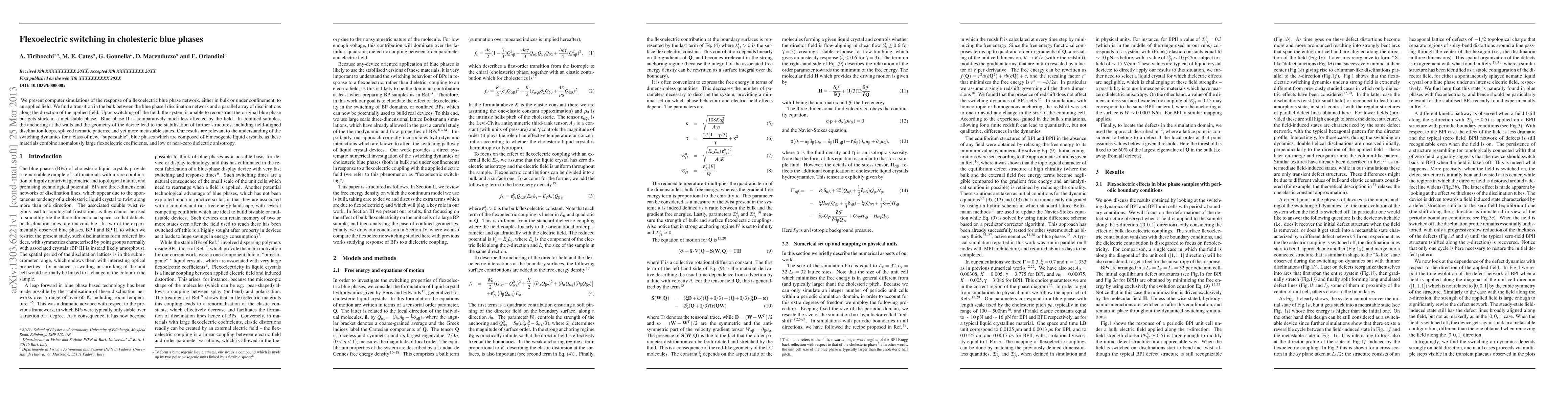 This paper investigates the flexoelectric switching behavior in cholesteric blue phases through computer simulations, revealing a transition in bulk phases under an applied field and the formation of metastable states. Confined samples exhibit additional structures and further stabilization due to wall anchoring and geometry.