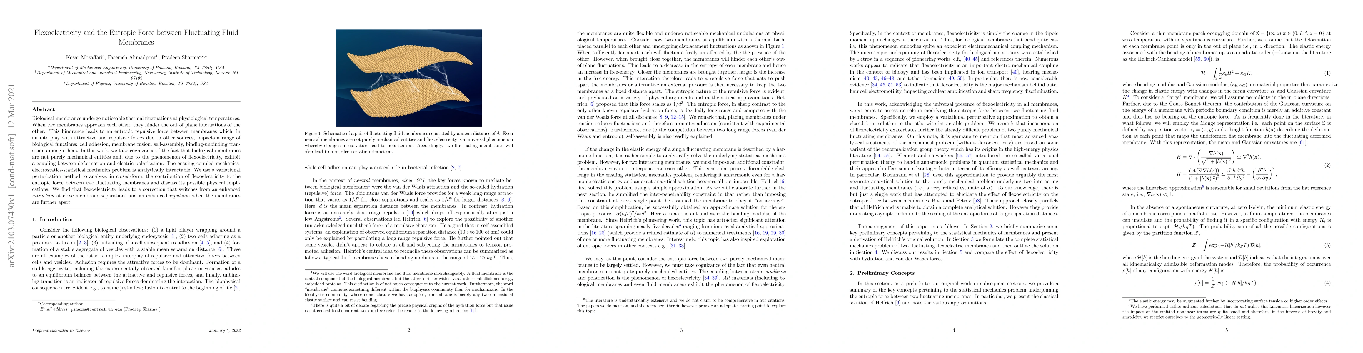 This paper investigates the interplay between flexoelectricity and entropic forces in fluctuating biological membranes, revealing a correction that alters the interaction from attraction to repulsion as membrane separation changes. The study employs a variational perturbation method to provide a closed-form analysis of this complex coupled mechanics-electrostatics problem.