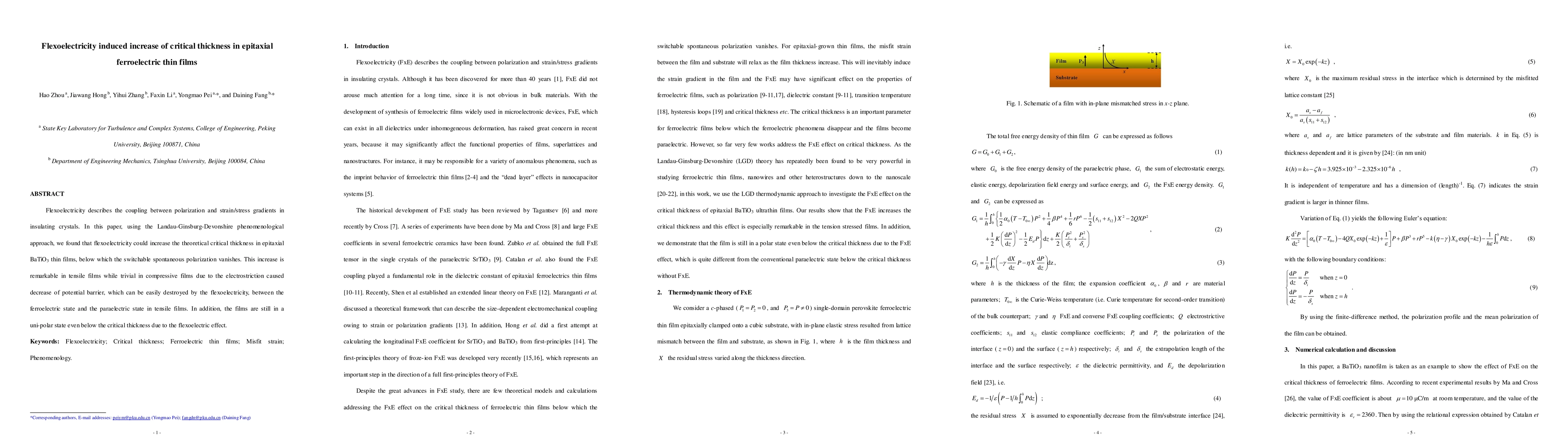 This study demonstrates that flexoelectricity can significantly increase the critical thickness of epitaxial BaTiO3 thin films below which spontaneous polarization vanishes, particularly in tensile films where the flexoelectric effect maintains a uni-polar state despite reduced thickness. In contrast, compressive films show minimal increase due to the counteracting effects of electrostriction.