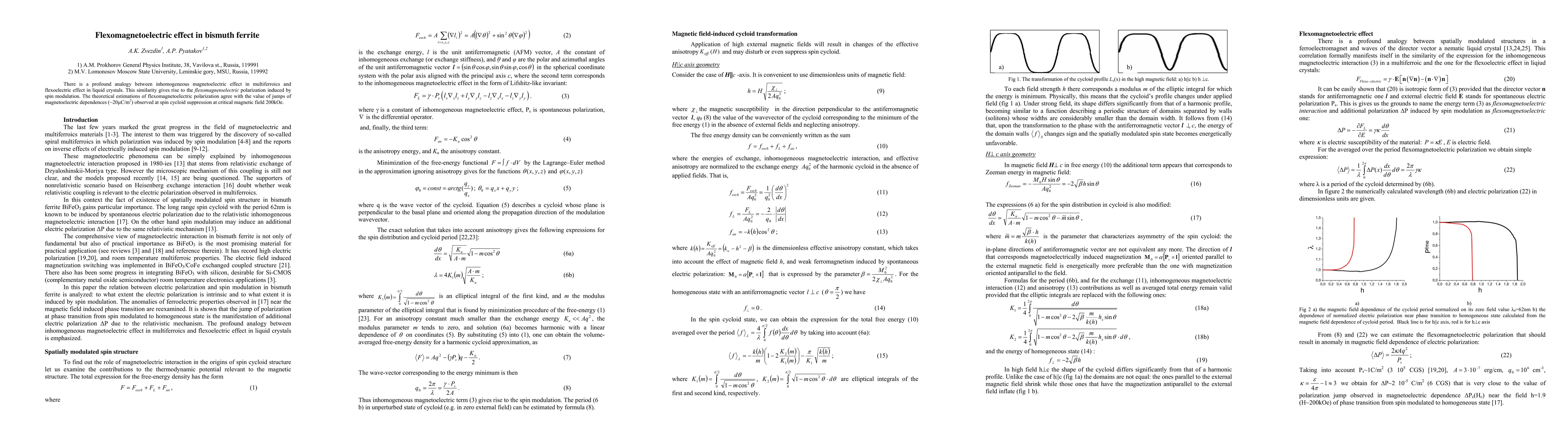 This paper explores the flexomagnetoelectric effect in bismuth ferrite, revealing a similarity between the magnetoelectric effect in multiferroics and the flexoelectric effect in liquid crystals, leading to flexomagnetoelectric polarization induced by spin modulation. Theoretical estimates match observed polarization jumps (~20μC/m²) at spin cycloid suppression under a critical magnetic field of 200 kOe.