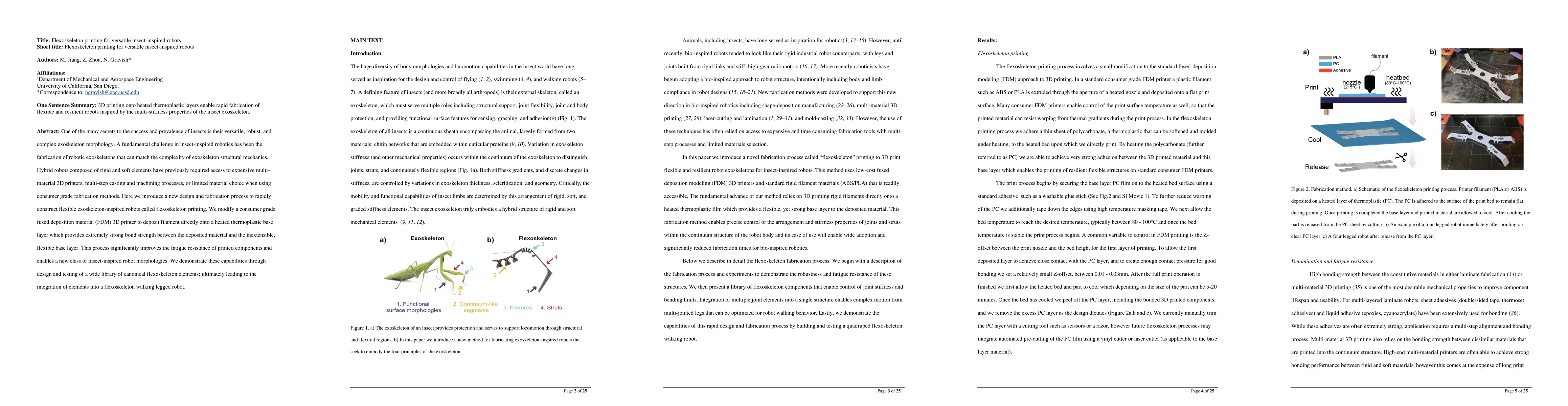 This research introduces 'flexoskeleton printing', a method using a modified consumer-grade 3D printer to create robust, flexible robotic exoskeletons. It significantly enhances fatigue resistance and enables diverse insect-inspired robot designs, demonstrated through a library of elements and a walking legged robot.