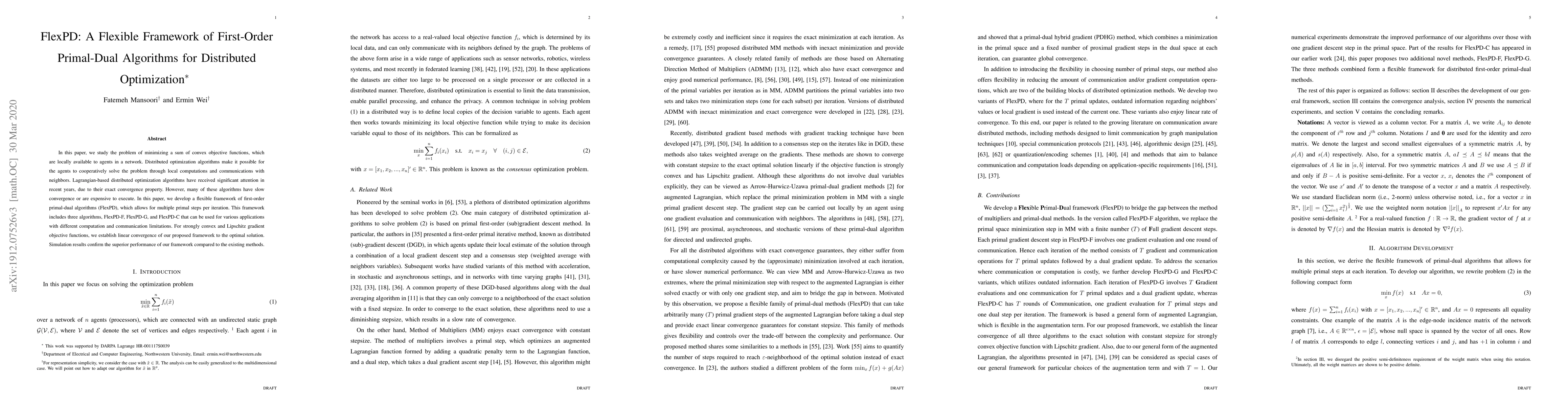 This paper introduces FlexPD, a flexible framework of first-order primal-dual algorithms for distributed optimization, enabling multiple primal steps per iteration. It presents three algorithms within the framework, demonstrating linear convergence for strongly convex and Lipschitz gradient objectives, and showing superior performance over existing methods in simulations.