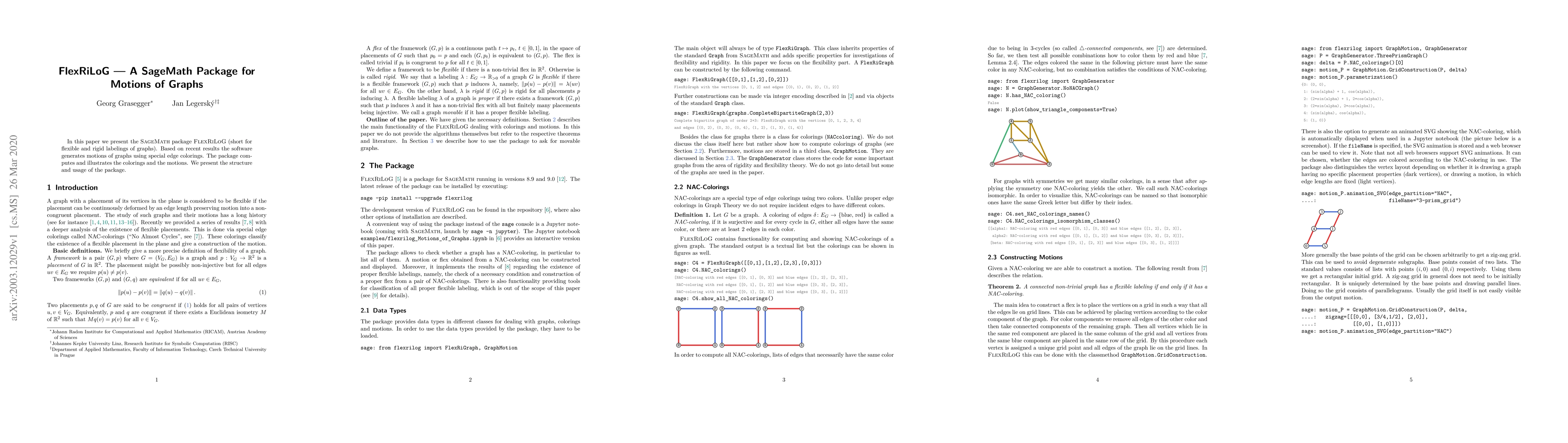 In this paper we present the SageMath package FlexRiLoG (short for flexible and rigid labelings of graphs). Based on recent results the software generates motions of graphs using special edge colorings. The package computes and illustrates the colorings and the motions. We present the structure and usage of the package.