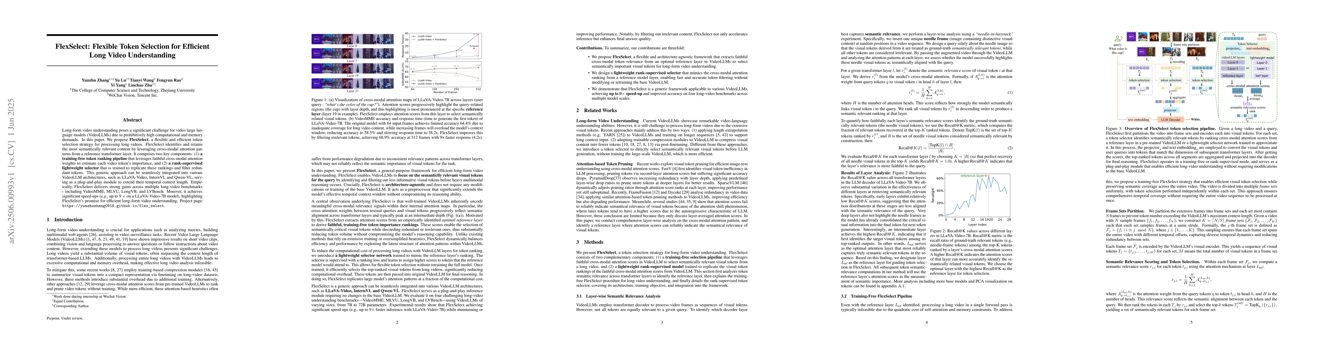 The paper proposes FlexSelect, a flexible and efficient token selection strategy for long video understanding using cross-modal attention patterns from a reference transformer layer. It consists of a training-free token ranking pipeline and a rank-supervised lightweight selector.