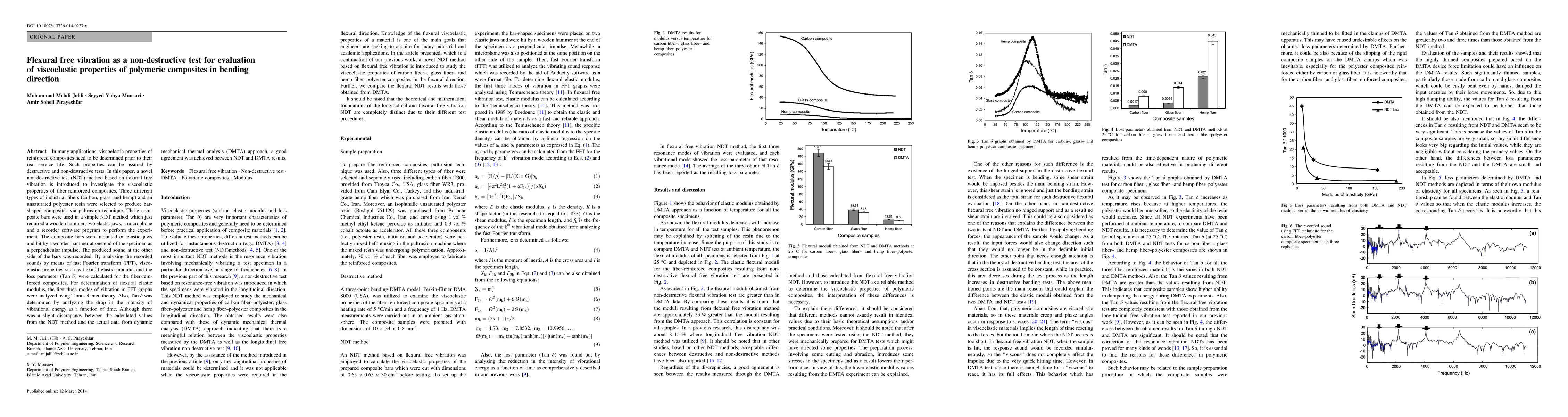 This paper introduces a non-destructive test (NDT) method based on flexural free vibration to evaluate the viscoelastic properties of fiber-reinforced polymer composites. The method uses a simple setup involving a wooden hammer, elastic jaws, and a microphone to record vibration sounds, which are then analyzed via FFT to determine properties like flexural elastic modulus and Tan δ, showing good agreement with dynamic mechanical thermal analysis (DMTA) results.