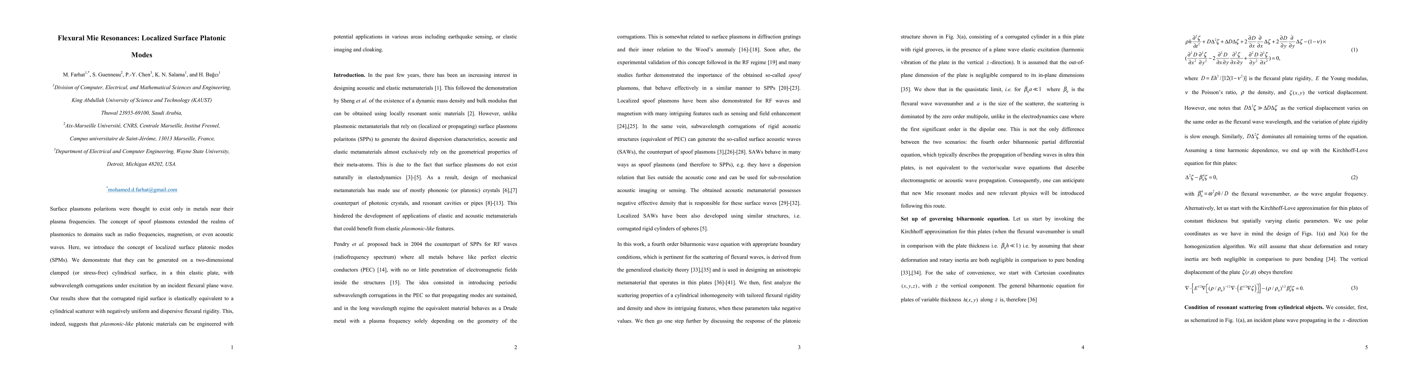 Surface plasmons polaritons were thought to exist only in metals near their plasma frequencies. The concept of spoof plasmons extended the realms of plasmonics to domains such as radio frequencies, magnetism, or even acoustic waves. Here, we introduce the concept of localized surface platonic modes (SPMs). We demonstrate that they can be generated on a two-dimensional clamped (or stress-free) cylindrical surface, in a thin elastic plate, with subwavelength corrugations under excitation by an incident flexural plane wave. Our results show that the corrugated rigid surface is elastically equivalent to a cylindrical scatterer with negatively uniform and dispersive flexural rigidity. This, indeed, suggests that plasmonic-like platonic materials can be engineered with potential applications in various areas including earthquake sensing, or elastic imaging and cloaking.