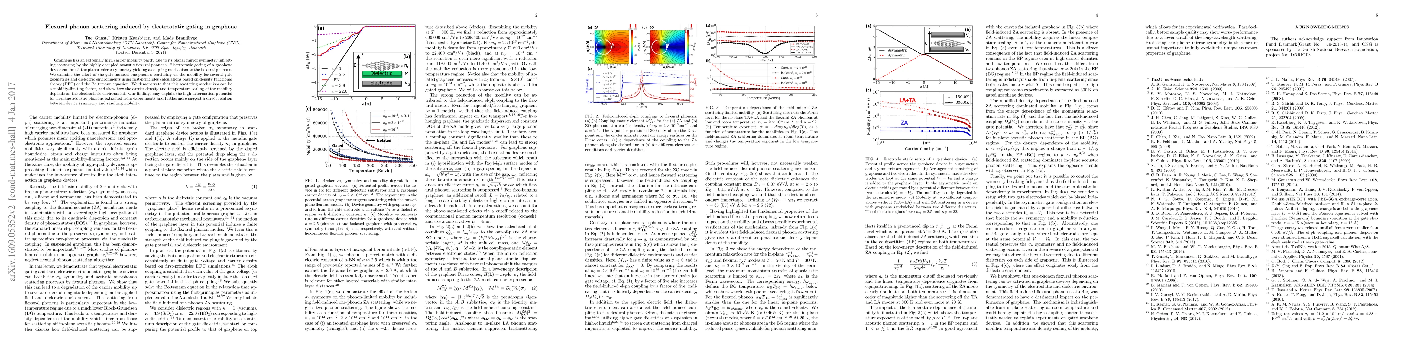 This paper investigates how electrostatic gating disrupts the planar mirror symmetry in graphene, leading to flexural phonon scattering and reduced carrier mobility. The study uses DFT and the Boltzmann equation to show that gate-induced phonon scattering can limit mobility, and it highlights the dependency of mobility on carrier density and temperature based on the electrostatic environment.