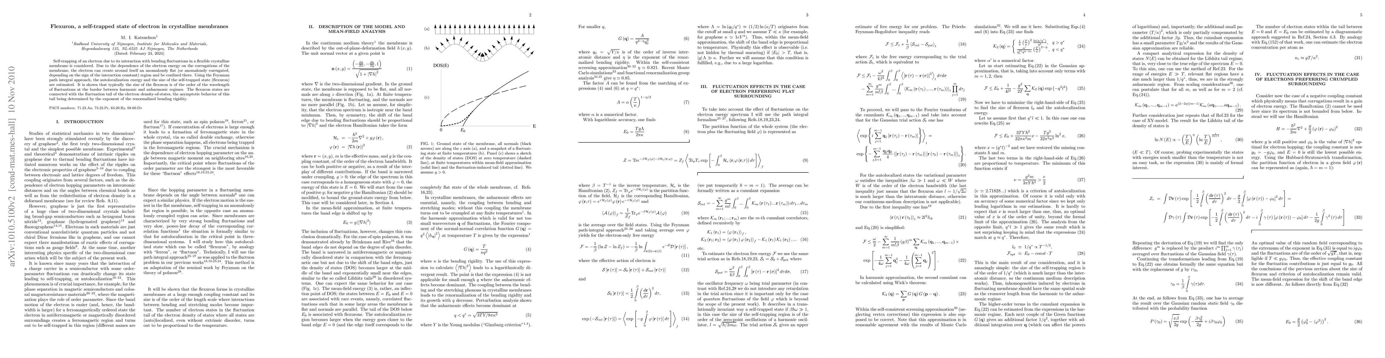 Researchers describe a self-trapped state of electrons in crystalline membranes, where an electron's interaction with membrane fluctuations creates a flat region around it. This 'flexuron' state is typically around the wavelength of membrane fluctuations.