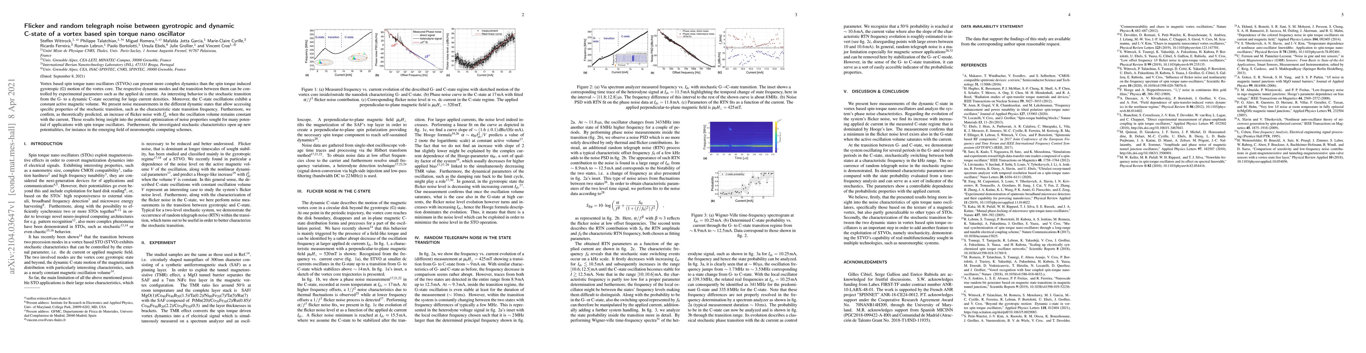 This paper investigates the stochastic transitions between gyrotropic and dynamic C-state in vortex-based spin torque nano oscillators, revealing flicker noise characteristics that increase with $I_{dc}^2$ under constant oscillation volume. The findings provide insights for optimizing noise properties in RF applications and suggest potential in neuromorphic computing.