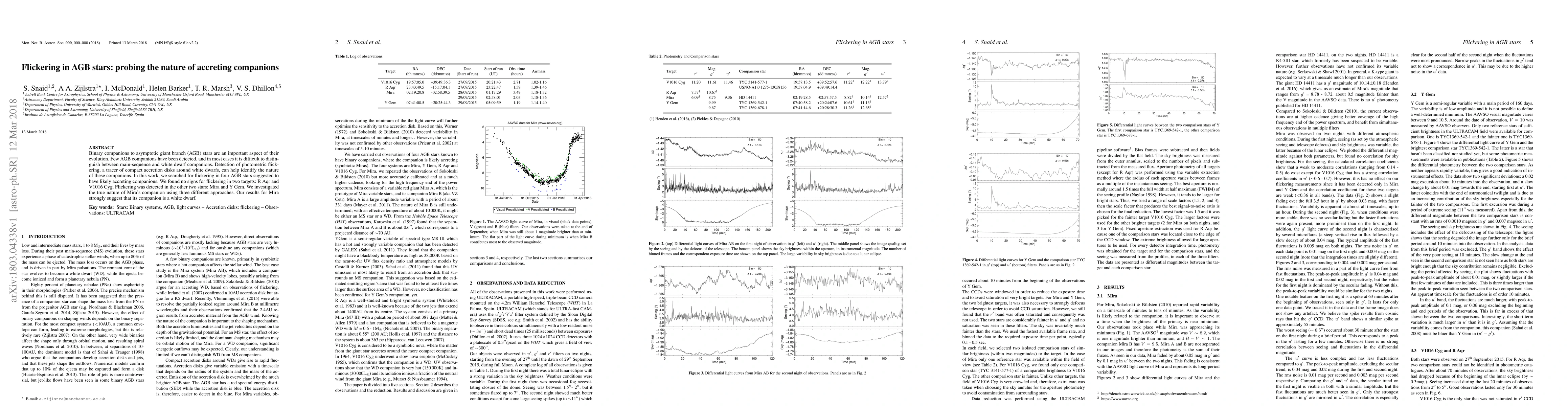 This study investigates the nature of binary companions to AGB stars by searching for flickering, a sign of accretion disks around white dwarfs, in four AGB stars. While no flickering was detected in R~Aqr and V1016 Cyg, it was found in Mira and Y Gem, with strong evidence suggesting that Mira's companion is a white dwarf.