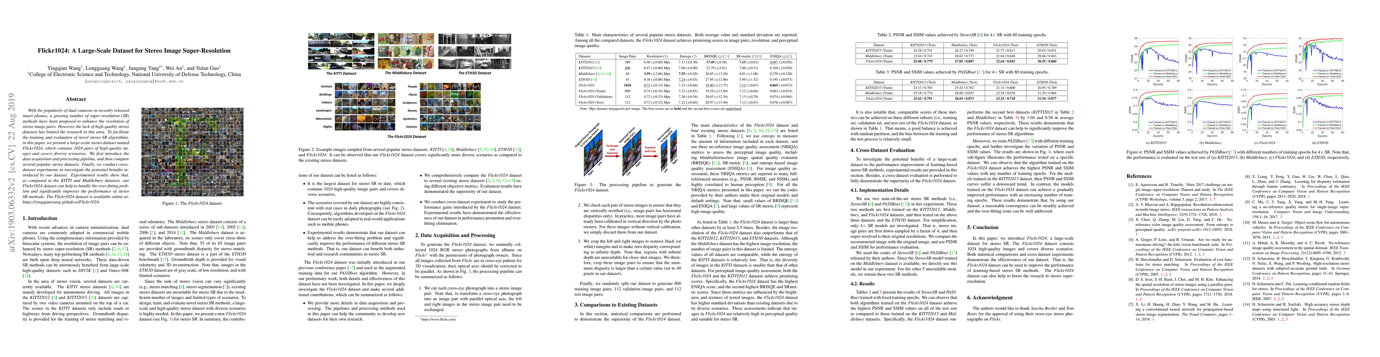 The paper introduces Flickr1024, a large-scale stereo image super-resolution dataset containing 1024 high-quality image pairs to facilitate research in stereo SR algorithms. Experimental results indicate that it outperforms existing datasets like KITTI and Middlebury, addressing over-fitting and improving stereo SR performance.