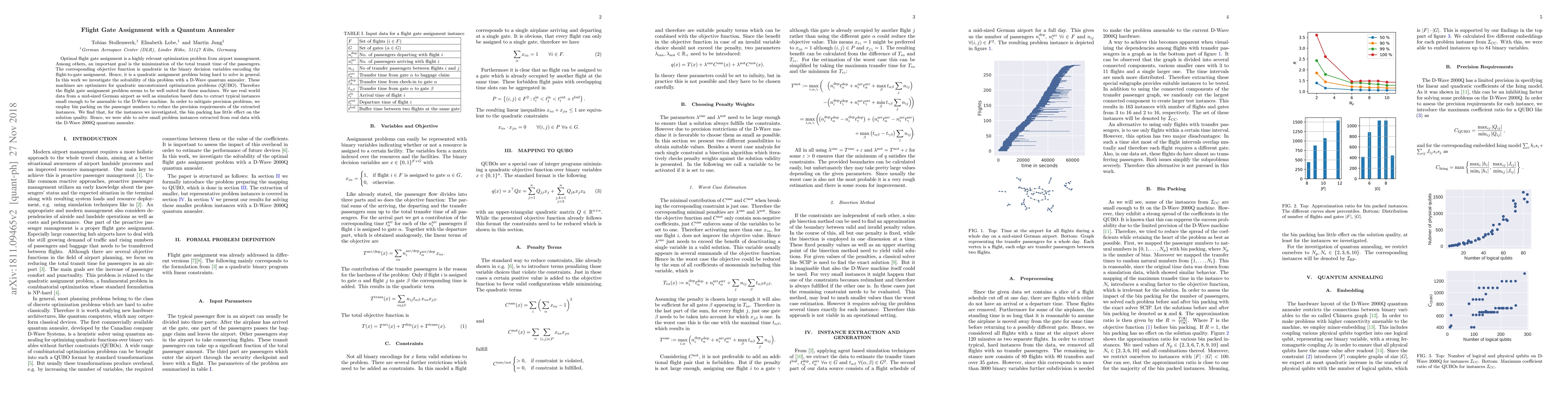 This paper explores the application of a D-Wave quantum annealer to solve the quadratic assignment problem of optimal flight gate assignment, aiming to minimize passenger transit time. The authors use real-world data from a German airport and find that bin packing helps mitigate precision issues, allowing successful problem instance solutions on the D-Wave 2000Q.