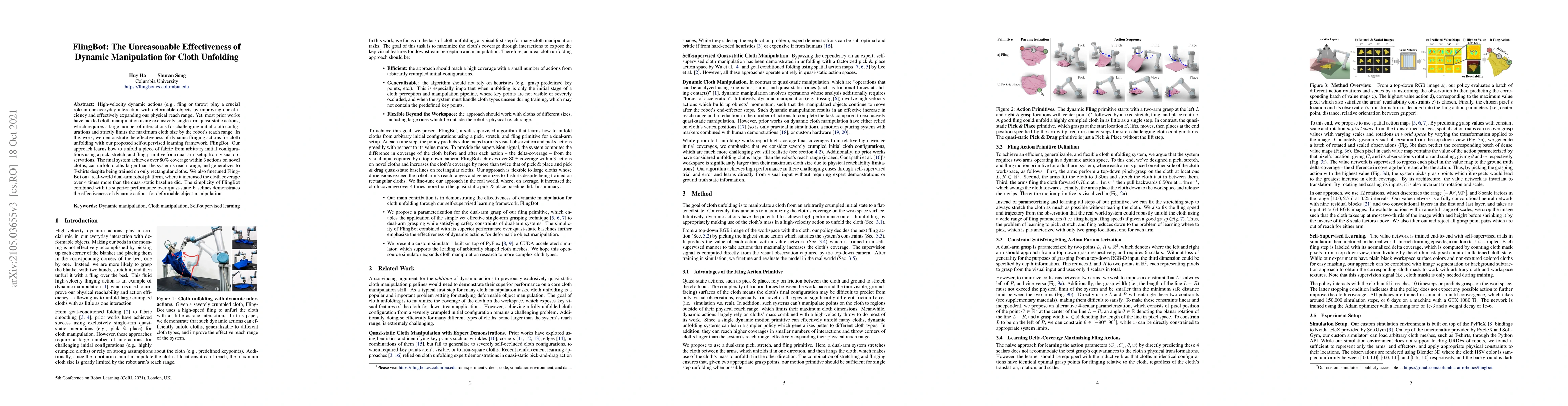 FlingBot leverages dynamic flinging actions to efficiently unfold cloth from arbitrary configurations using a self-supervised learning framework. It achieves over 80% coverage in 3 actions, generalizes to larger and different cloth types, and significantly outperforms quasi-static methods on a dual-arm robot platform.