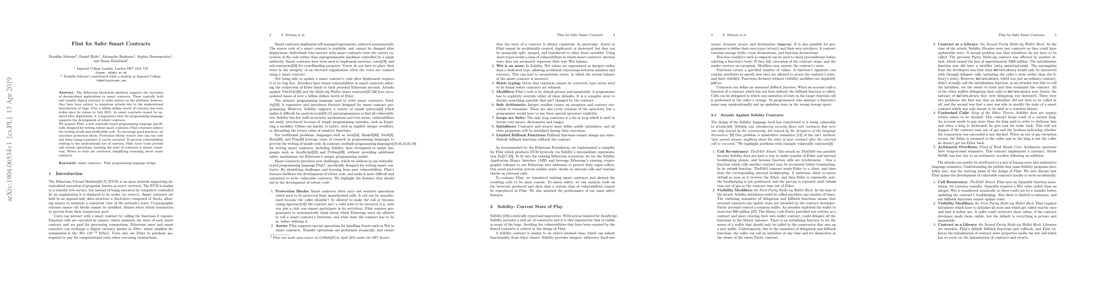 The paper proposes Flint, a statically-typed programming language designed for developing secure smart contracts on the Ethereum blockchain. Flint features protection blocks and Asset traits to enforce safe coding practices, ensuring robust, predictable, and secure smart contract execution.