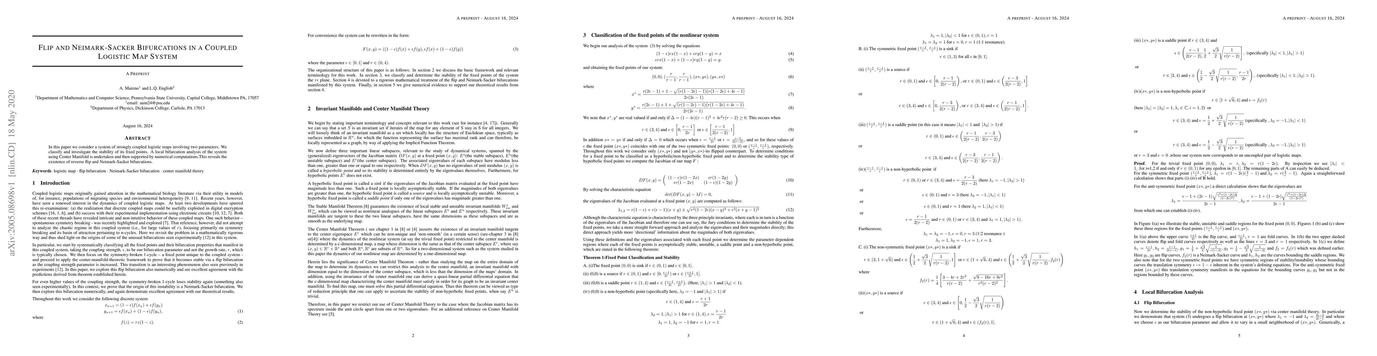 This paper studies a coupled logistic map system with two parameters, classifying and analyzing its fixed points' stability. Through local bifurcation analysis and numerical computations, it uncovers reverse flip and Neimark-Sacker bifurcations.