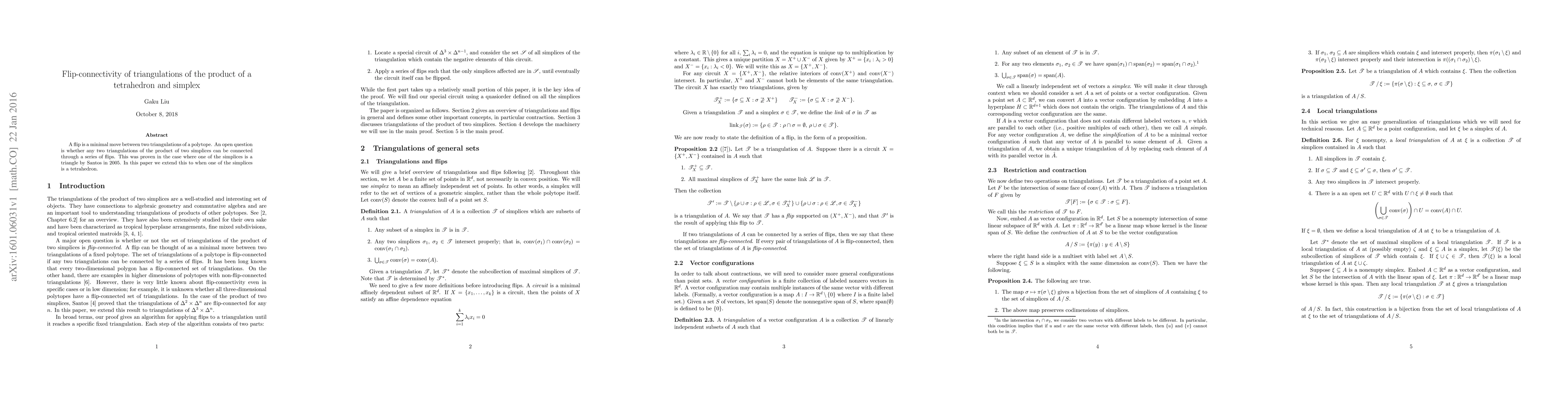 A flip is a minimal move between two triangulations of a polytope. An open question is whether any two triangulations of the product of two simplices can be connected through a series of flips. This was proven in the case where one of the simplices is a triangle by Santos in 2005. In this paper we extend this to when one of the simplices is a tetrahedron.